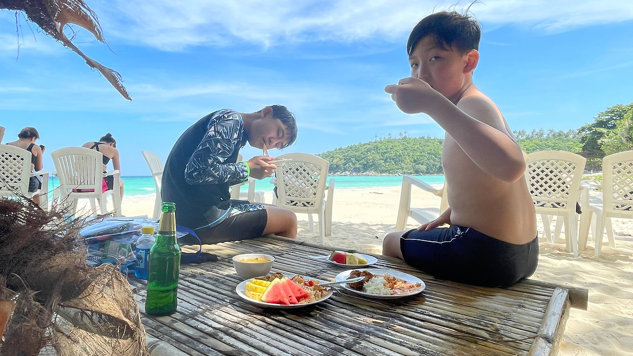 스노클링을 오래간만에 하니 애도 나도 힘들어 섬으로 내려 점심을 먹고 쉬기로 하였다. 아이들은 둘이 같이 놀면서 시간을 보내고, 나는 어제의 스트레스를 풀기 위해 병맥주를 하나 시켰다. 아~ 이 얼마만의 창 비어인가?