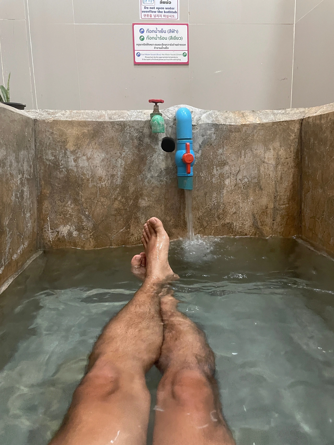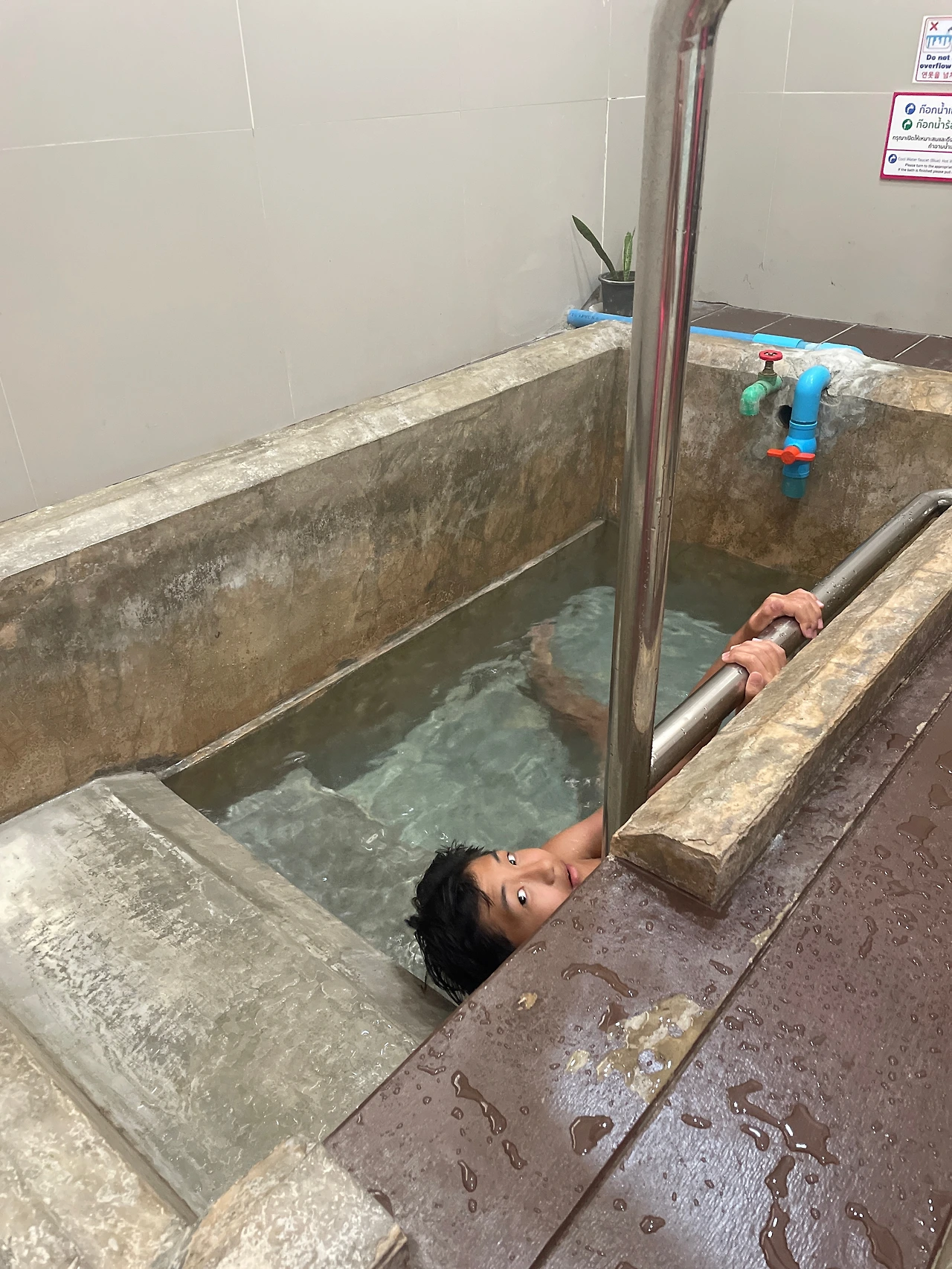 녹차 받을 나와 또 30km 달려 블랙하우스에 도착했지만 어린이들이 관람하기엔 좀 난도가 있어 박물관 앞에서 기념사진 한 장 찍고, 화이트, 블루, 블랙 투어를 완성했다. 이후 달려간 곳은 최종 목적지인 온천이었다. 족욕만 하려는 아이들을 구슬려 개인탕을 3인 160밧에 계란과 수건을 추가 구매하여 들어갔다.