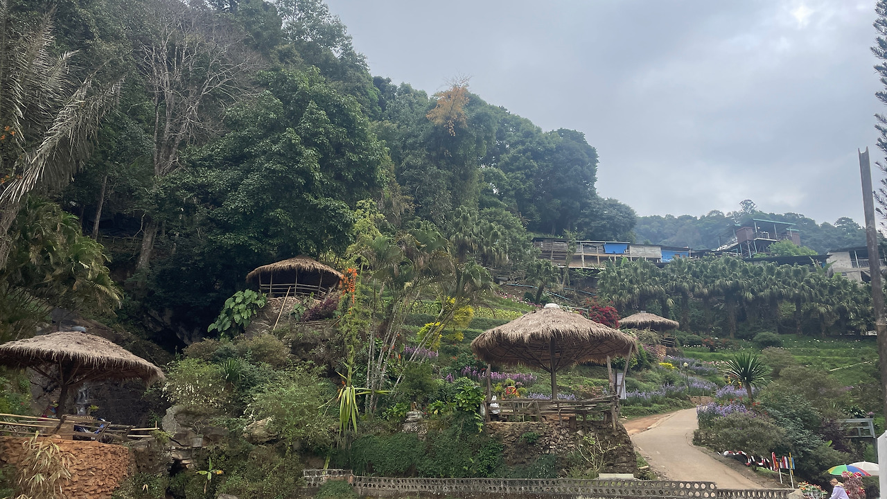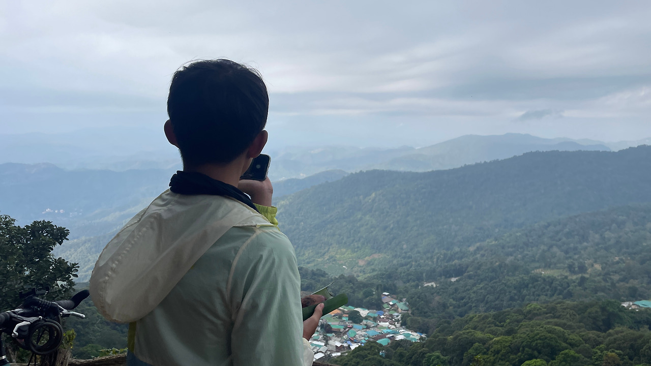 이곳까지 올라온 거 주변의 전망대를 들러 보기로 했다. 운무가 끼면 경치가 좋은데 오늘은 날씨가 흐려 운무는 볼 수없었다. 도착한 곳은 Doi Hua Moo 뷰 퍼안트라는 곳으로 거기에는 작은 기념품 상점과 옥수수와 고구마를 파는 가게가 하나 있었다. 옥수수와 고구마를 후식으로 먹으며 풍경을 사진에 담았다. 방금 지나왔던 도이 뿌이 마을이 한눈에 들어왔다. 벌써 몇몇 현지인들이 오토바이와 자전거를 타고 도착해 풍경을 즐기고 있었다.