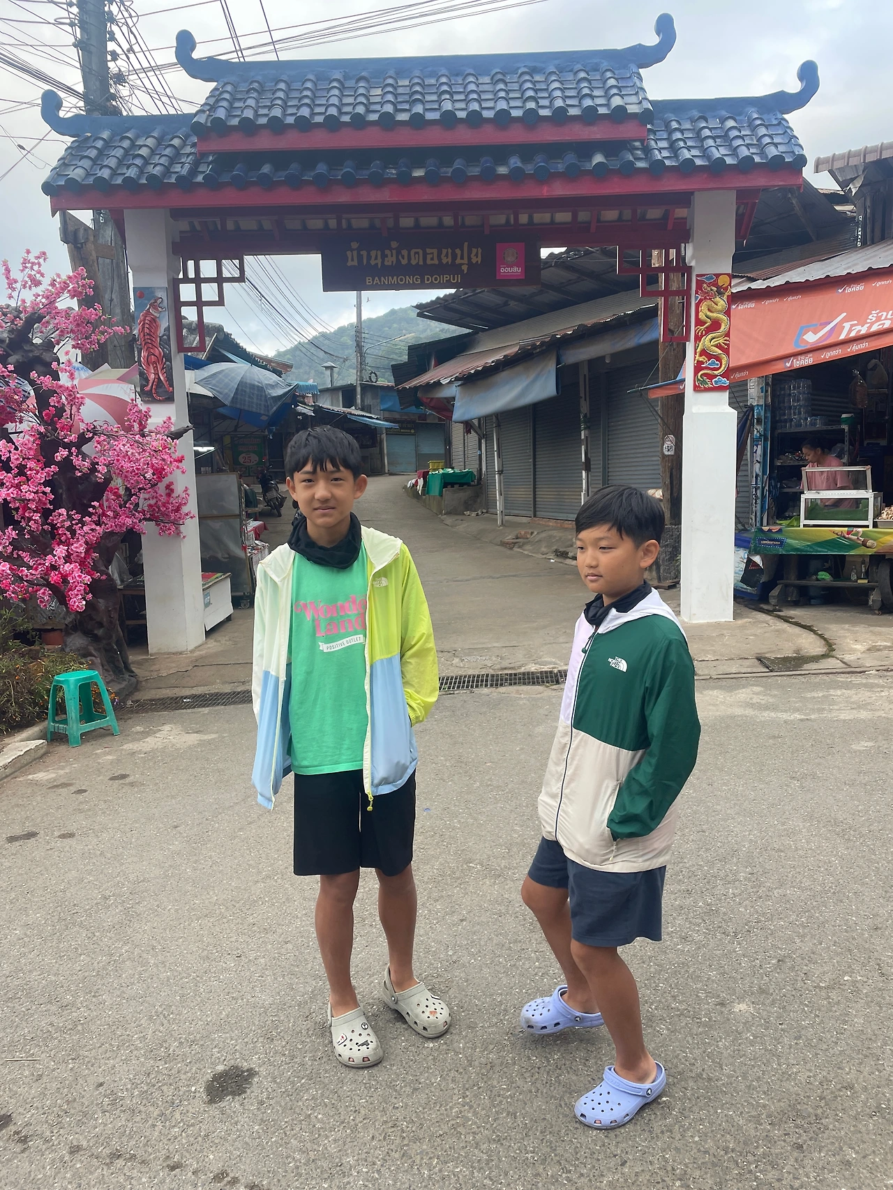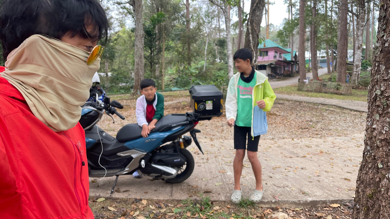 어제 빌려 둔 700밧짜리 혼다 오토바이를 제값에 운영시키기 위해 어젯밤 대략적인 일정을 짰다. 치앙마이 대표 여행지인 도이수텝과 타페문 안쪽 사원 정도 덜아보고 휴식의 시간을 가지는 것으로 계획했다. 출발 시간은 7:00으로 잡았지만 아침에 애들 준비를 시키고 이동하는 것이 결코 쉬운 것이 아니다. 8:00에 오토바이를 태워 도이수텝으로 출발했다. 날씨가 선선하여 아이들과 바람막이를 입고 라이딩을 시작했다. 님만해민을 지나니 본격적인 커브길이 시작되었다. 아침이라 올라가는 차는 보이지 않았고, 급경사의 길을 오르는 러너들과 자전거 라이딩 팀들을 신경 쓰면서 도이수텝에 도착했는데 너무 일찍 일어나 몽족 마을인 도이뿌이를 더 가보기로 하고 45분 만에 30km를 달려 마을에 도착했다.