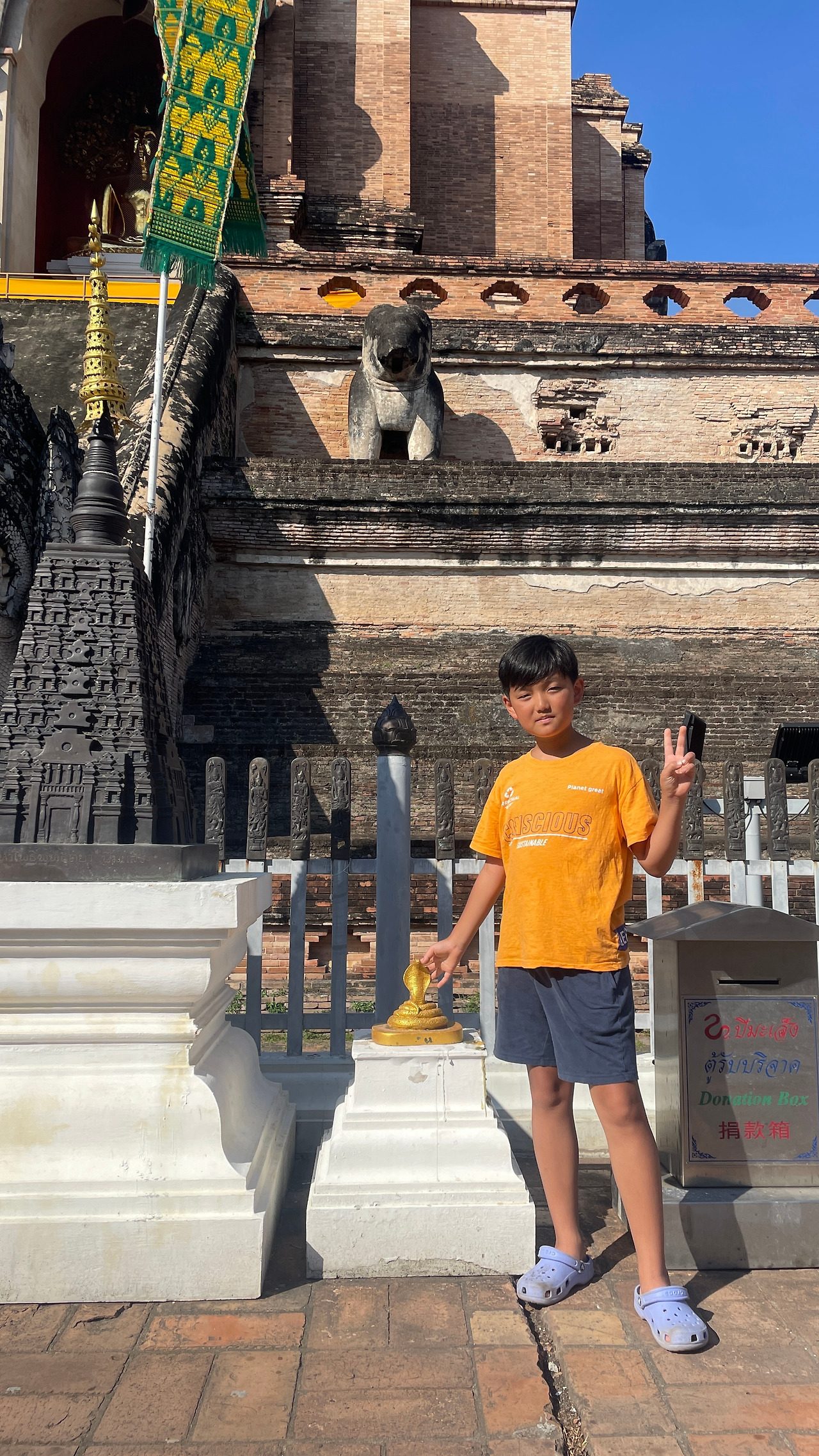 자리를 만들어 앉고 뷔페 공략을 시작했는데, 둘째는 닭구이 하나 달랑 가져왔다. 평소 같으면 많이 먹으라고 닦달했겠지만 둘째는 부자인양 닭구이 하나에 아이스크림 두 스푼으로 점심을 마감했다. 아이고 돈 아까워라라는 생각에 내가 과식을 했다. 오늘 18:00 오토바이 반납이라 더운데 걸어서 타페문 안 쪽 사원을 보니 오토바이 있을 때 보자는 생각에 왓 째디 루앙을 찾았다. 10년 전에 왔었는데 다시 아이들과 배낭여행으로 찾으니 느낌이 새로웠다. 아이들도 기존의 사원과 다른 모습에 흥미를 느꼈다. 나오는 쪽에 12 지신을 형상화한 곳을 보니 3 부자의 지신이 연속해 붙어있었다. 토끼, 용, 뱀이 나란히 있어 기념으로 촬영했다. 엄마는 말띠로 4 가족 모두 연결된 띠를 가지고 있음을 오늘 처음 알았다.