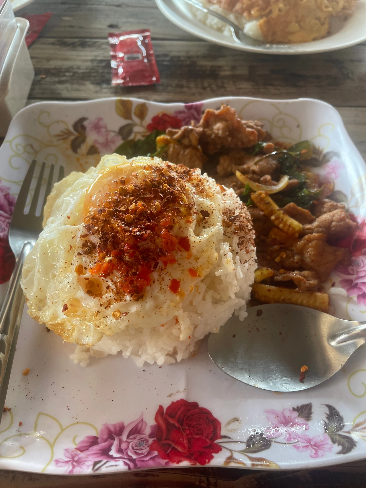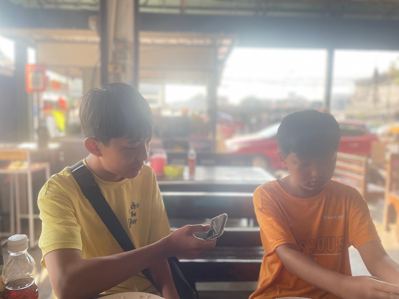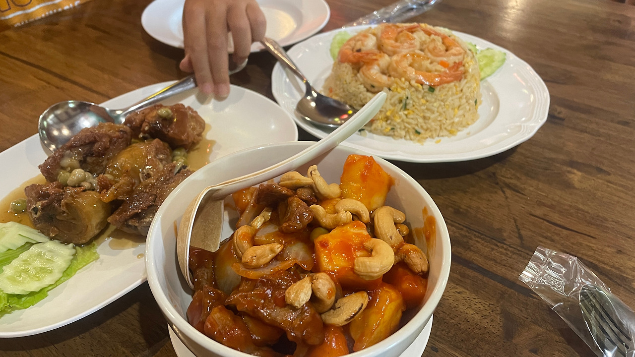 여하튼, 버스를 타러 택시를 불러 100밧을 주고 터미널에 도착했다. 이틀 전 식사를 했던 식당에서 아침 식사를 하고 버스시간까지 쉬었다. 아이들이 가장 먹기 편해하는 것은 역시 오믈렛이었다. 태국 오믈렛은 달걀을 튀기듯 해서 조리하는 것이 특징이다.
