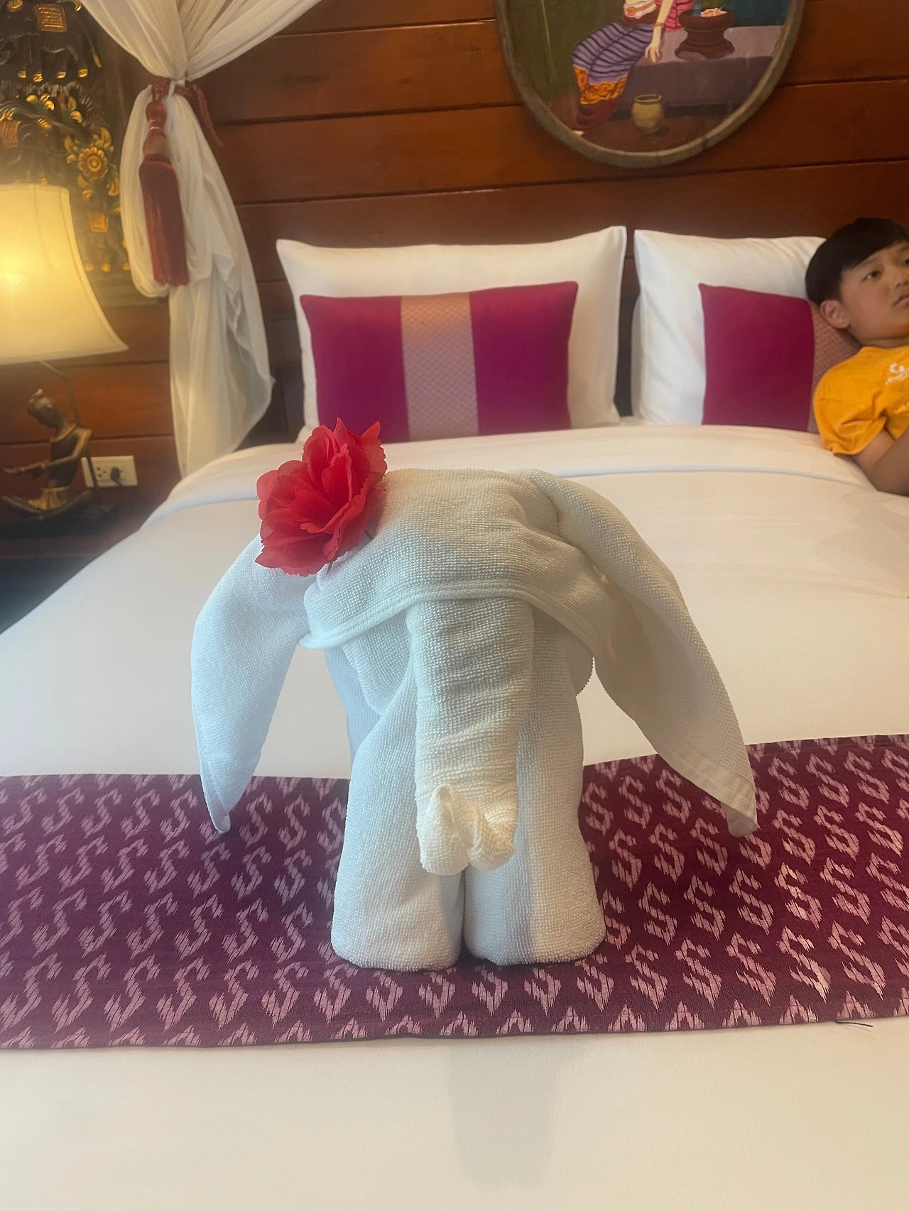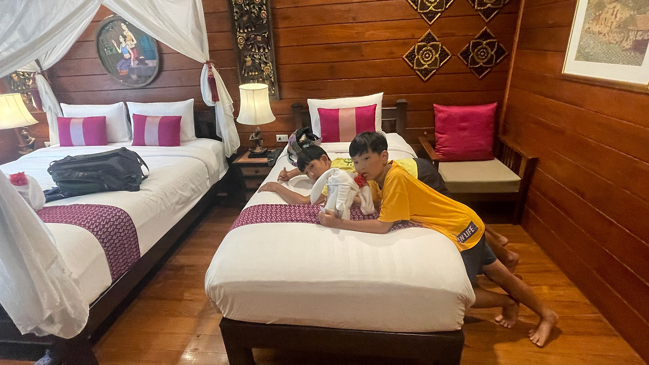 점심을 먹고 남은 700m를 걸어 리조트에 도착해서 체크인을 했다. 이번 배낭여행 중 가장 비싼 숙소라 나름 기대를 했는데, 역시 기대를 충족하는 숙소였다. 목재 인테리어에 수영장도 딸려 있어 아이들이 한낮의 더위를 식히기에도 충분했다. 게다가 조식까지 포함되어 있어 아침 식사를 여유롭게 할 수 있다는 장점까지.