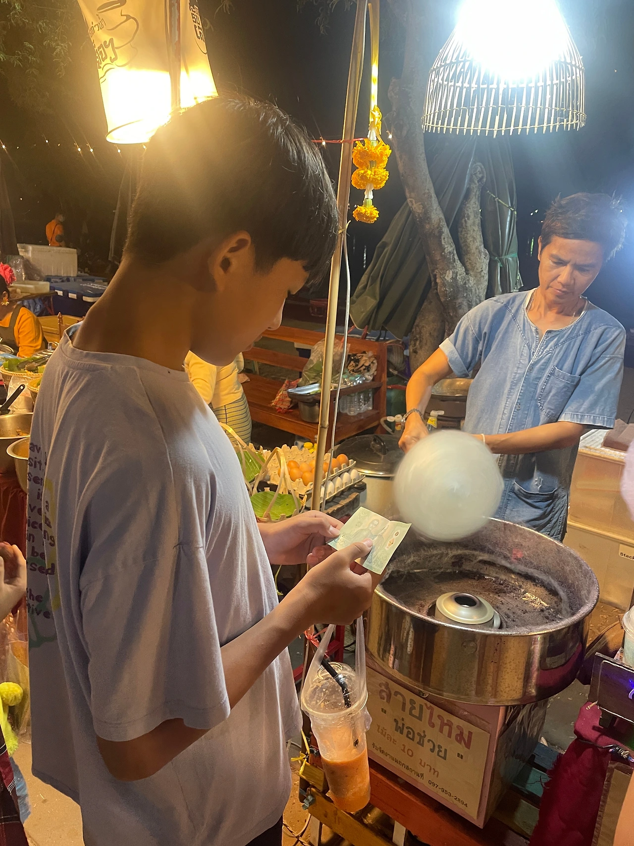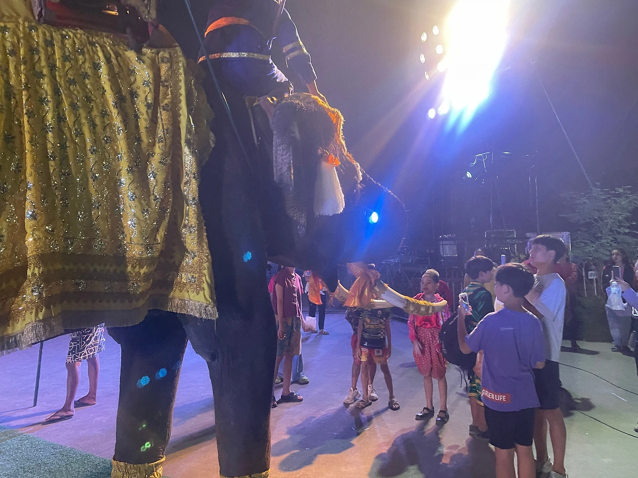 아이들이 좋아하는 솜사탕을 비롯하여 타이의 다양한 간식거리와 팟타이 같은 음식을 현지에서 구매하여 먹을 수 있었다. 아이들이 제일 맛나게 먹은 것은 35밧 주고 구매한 다양한 과일 주스였다. 랑캄행 왕 동상 앞에서는 코끼리가 주민들과 어울려 놀고 있었다. 동물원에 갇힌 코끼리가 아니라 주만들과 어울려 살아가는 코끼리를 볼 수 있는 건 태국만의 특징이 아닐까?