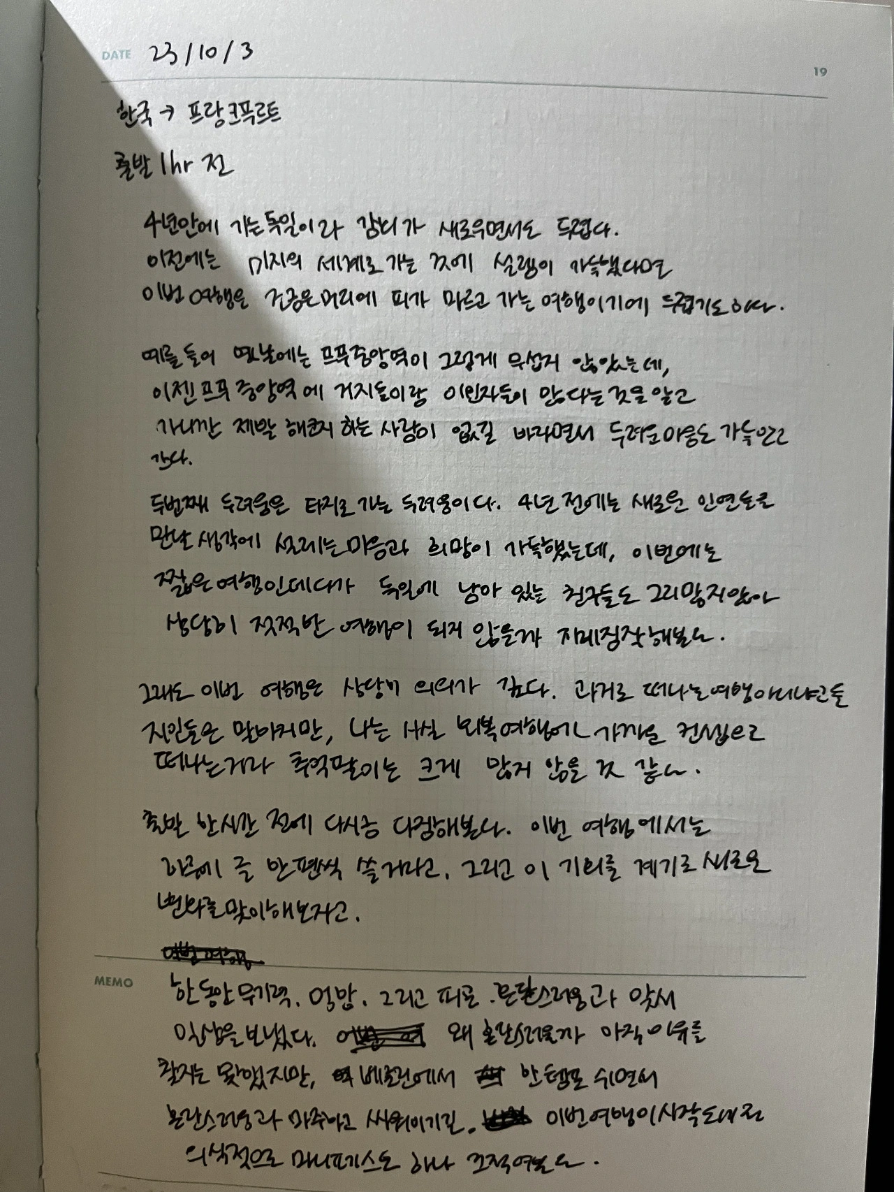 10월 3일 오전 9시 40분 비행기를 타고 프랑크푸르트로 향하는 비행기를 탔다. 공항 수속을 빨리 밟고 설레는 마음으로 비행기 게이트에 앉아 이번 여행의 마니페스토를 작성했다. 이번 여행을 통해 변화한 나를 맞이하고 싶은 의지가 강했고, 귀국 후에도 이번 여행의 가치를 잃지 않고 오래 지속하고 싶어 조금의 과장을 더해 “마니페스토”라고 명명해보았다.