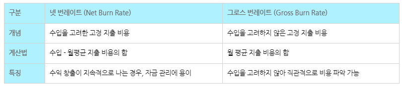 2️⃣ 수익이 발생하고 있다면, 미래에도 지속적으로 안정적인 수입 조달이 예상된다면, 넷 번레이트 개념을 이용하길 추천합니다. 이때는 미래의 예상 수입도 번레이트에 반영하는 것이 좋습니다. 반대로 보수적으로 자금 운용 계획을 세우고자 한다면, 그로스 번레이트를 활용, 자금 안정성을 도모할 수도 있습니다.
