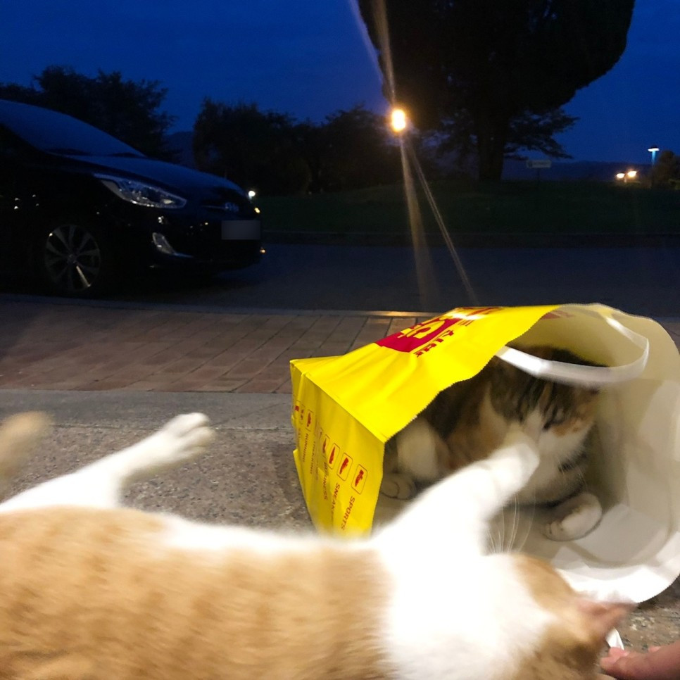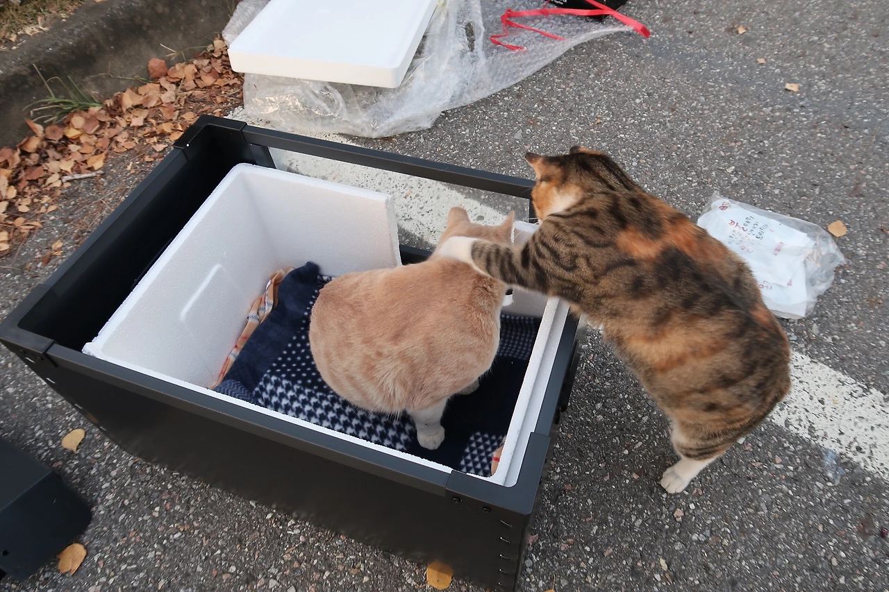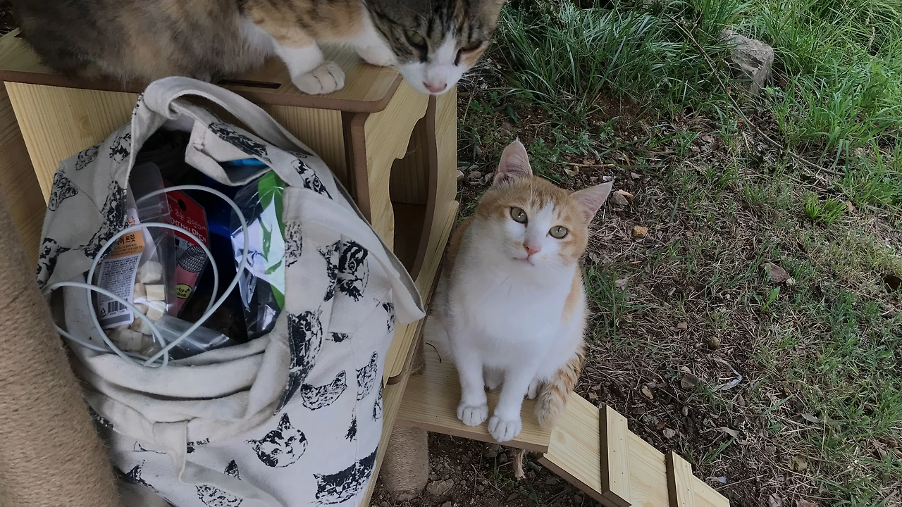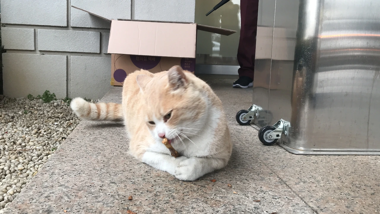 약속 시간이 되어 고양이들을 포획해가실 분이 도착하셨다. 고양이들의 상태를 멀리서 확인하고 말로만 듣던 통덫을 세팅했다. 통덫 끝 쪽에 맛있는 냄새가 나는 간식을 두고, 입구 쪽에도 맛보기로 조금 떨어뜨려두면 완성이었다. 하루를 내리 굶은 고양이들은 처음 보는 통덫에 경계심과 호기심을 동시에 느끼며 다가왔다. 그러다가 맛있는 냄새가 나자 기웃거리기 시작했다.