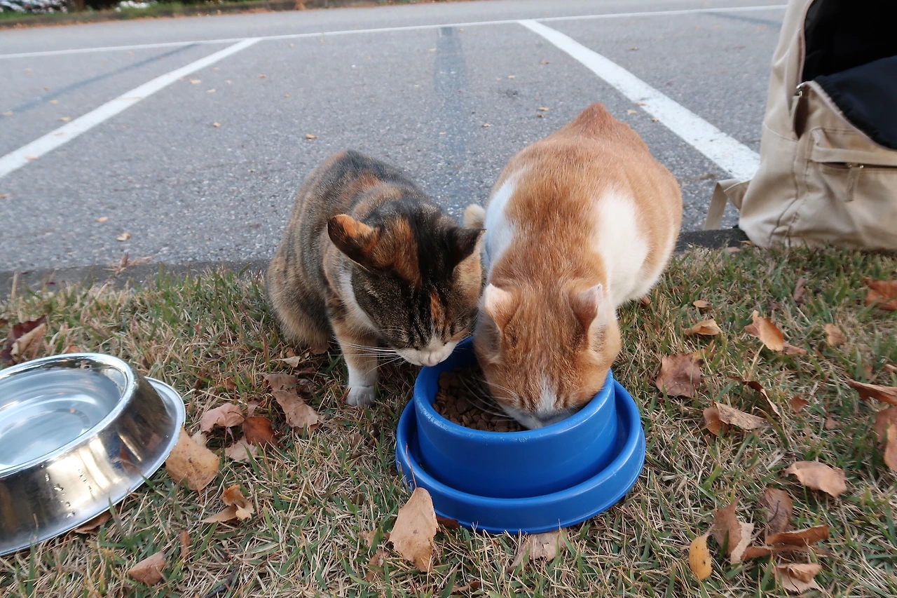 사정을 설명 들은 기숙사 집사님이 적어주신 안내문이 붙어있었다. 나를 본 아이들은 배고프던 차에 집사 잘 만났다며 기대에 찬 눈빛으로 졸졸 따라다니기 시작했다. 이맘때쯤 기숙사 고양이들의 집 위치가 기숙사 입구에서 주차장 쪽으로 바뀌었다. 한켠 자리를 내주는 것만으로도 고마운 마음이었다.