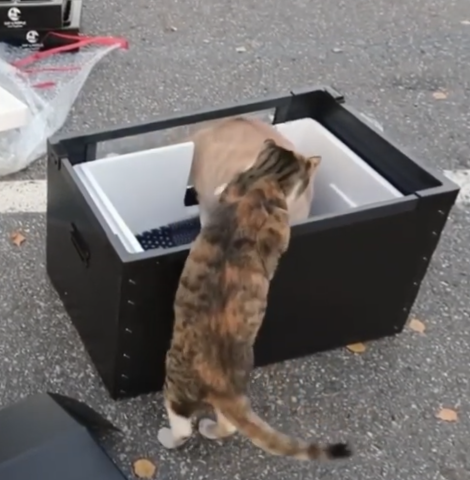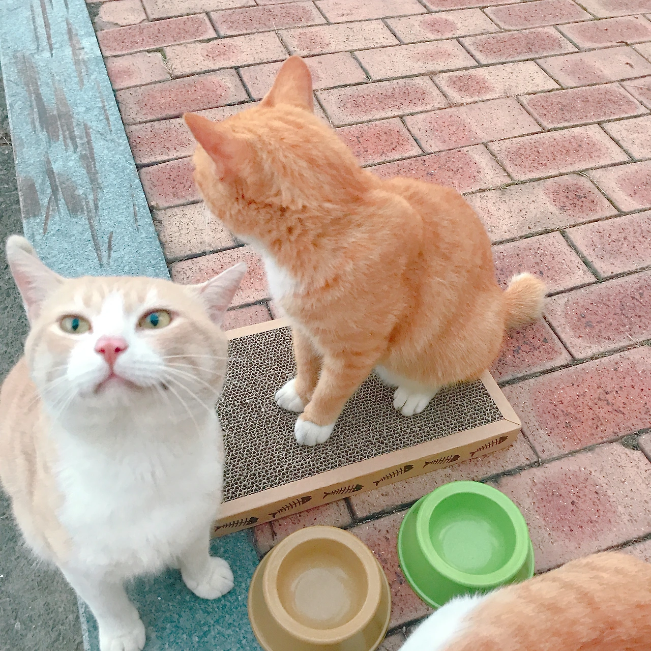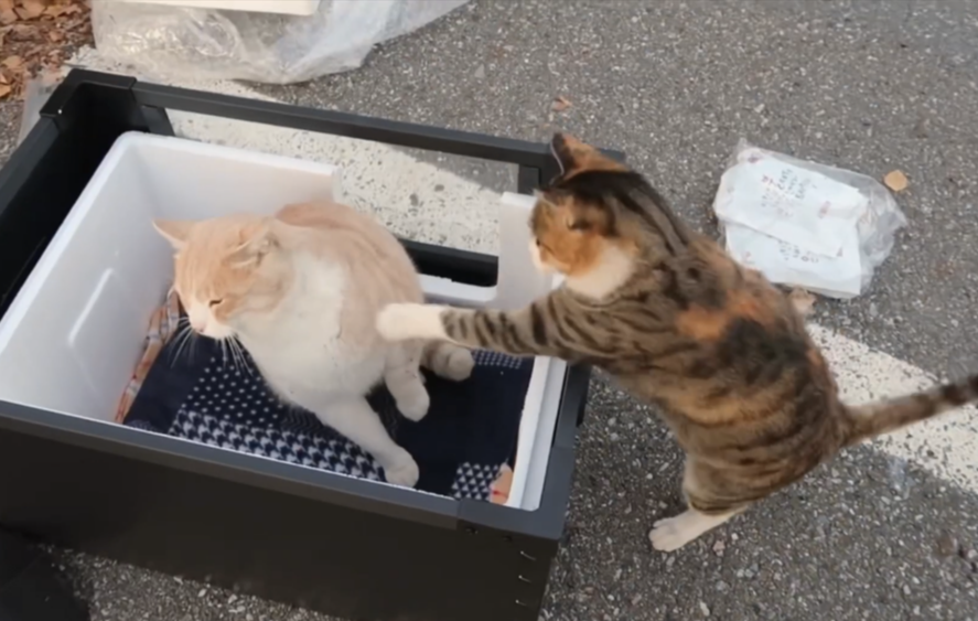이 날은 너무 추워 지나가는 사람이 거의 없었다. 밥을 차리려고 그릇을 내려놓는데 사료를 붓기도 전에 프레즐이 무릎 위로 달려들어 앉았다. 그만큼 추운 날이었다. 먹보 고양이들이 밥을 마다하고 온기를 택할 정도였다. 인간 방석을 놓친 크림이는 한참을 기웃거리며 다른 사람을 찾았지만 지나가는 사람이 없었고, 참다못해 프레즐이 앉아있는 내 무릎 위로 엉거주춤 올라왔다. 1냥 1 집사라는 암묵적인 룰이 깨지는 순간이었다.