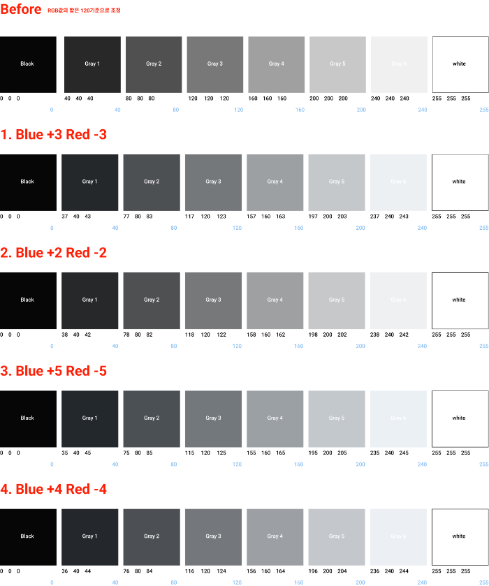 규칙적인 명도 값을 유지한 채 RGB 값을 조정하는 것이죠. (RGB의 R은 Red, G는 Green, B는 Blue입니다.) 예를 들어 30, 30, 30의 RGB 값을 가진 그레이의 톤을 바꾼다고 가정할 때, 총합인 90을 유지한 채 1을 더하면 1을 빼는 식의 방법입니다. 따라서 저의 경우도 총합을 유지한 채 조정하였습니다. 웜톤에서 쿨톤으로 탈바꿈하기 위해 Red는 줄이고 Blue를 더해보겠습니다.