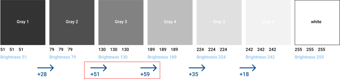 Gray Scale의 규칙성에 관해 쉽게 설명해놓은 글이 있어 이를 참고하였습니다. 이 글에 따라 명도 값을 구한 결과, 2에서 4의 단계의 명도 값이 슈퍼 점프하고 있었네요. 이를 변경해보겠습니다.