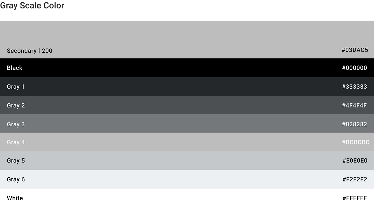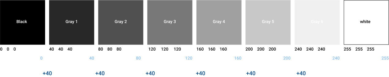기존 Scale에 따라 여섯 단계로 이루어진 색상의 명도 값은 40씩 증가하며, 추후 더 세분화된 컬러가 필요할 경우 20 또는 10의 단위로 쉽게 쪼개 설정할 수 있게 되었습니다. 어떤 컬러를 기준으로 명도 값을 조정할지 감이 안 잡힌다면 가장 밝은 컬러부터 테스트해보세요. 주로 Gray Scale의 가장 밝은 컬러는 시스템의 배경 컬러로 쓰이는데요. 어두운 색상을 기준으로 명도 값을 조정할 경우 배경이 어두워 보이거나 흰색과 큰 차이가 없어지는 경우가 발생하니 이를 염두하시는 것이 좋아요.