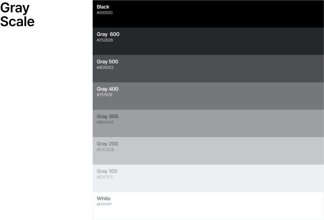 이 과정을 통해 바뀐 색상입니다. 이름 또한 Primary Color와 통일하여 Gray 100~600 형태로 변경하였습니다. 이렇게 통일성을 가지면 직관적이고 외우기도 쉬우니 명칭은 가급적 통일하는 것이 좋습니다.