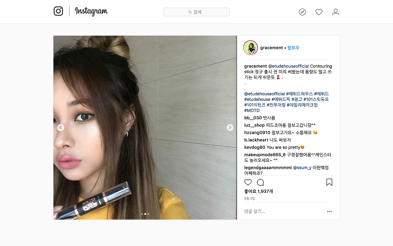 위 이미지는 최근 분석한 '에뛰드' 해시태그를 통해 알게 된 한 포스트다.