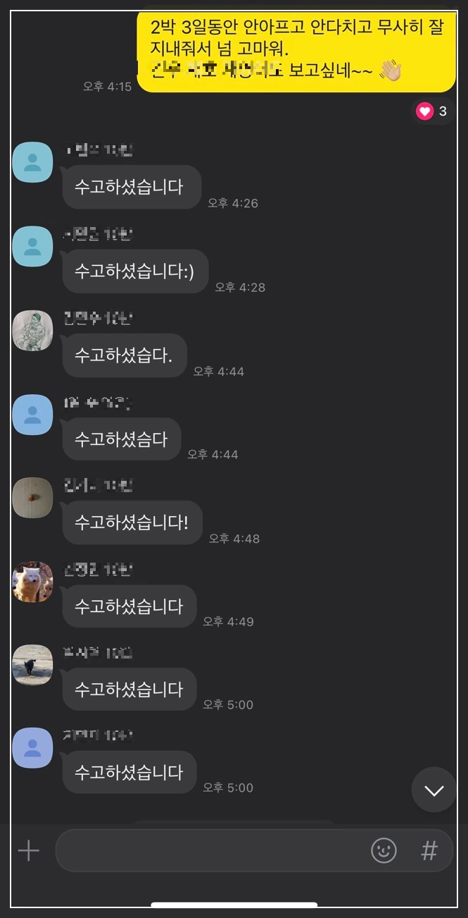 웃픈 상황도 있었지만, 함께 한 A조 선생님들 모든 분이 너무 따뜻하셨고, 성산일출봉에서 바라본 우리나라가 너무나도 눈이 부셔 그 풍경만으로도 만족할 수 있는 귀한 2박 3일이었다. 집으로 돌아가는 길에 수고 많았고, 아무도 아프지 않고, 다치지 않고 무사히 잘 다녀와 줘서 고맙다고, 월요일에 학교에서 보자고 단톡방에 남겼더니 몇 명이 공감하기 버튼으로 하트를 꾸욱 남겨주었고, 그러고 나서 달리기 시작한 댓글들. 이모티콘 하나 없는 담백한 ‘수고하셨습니다’.