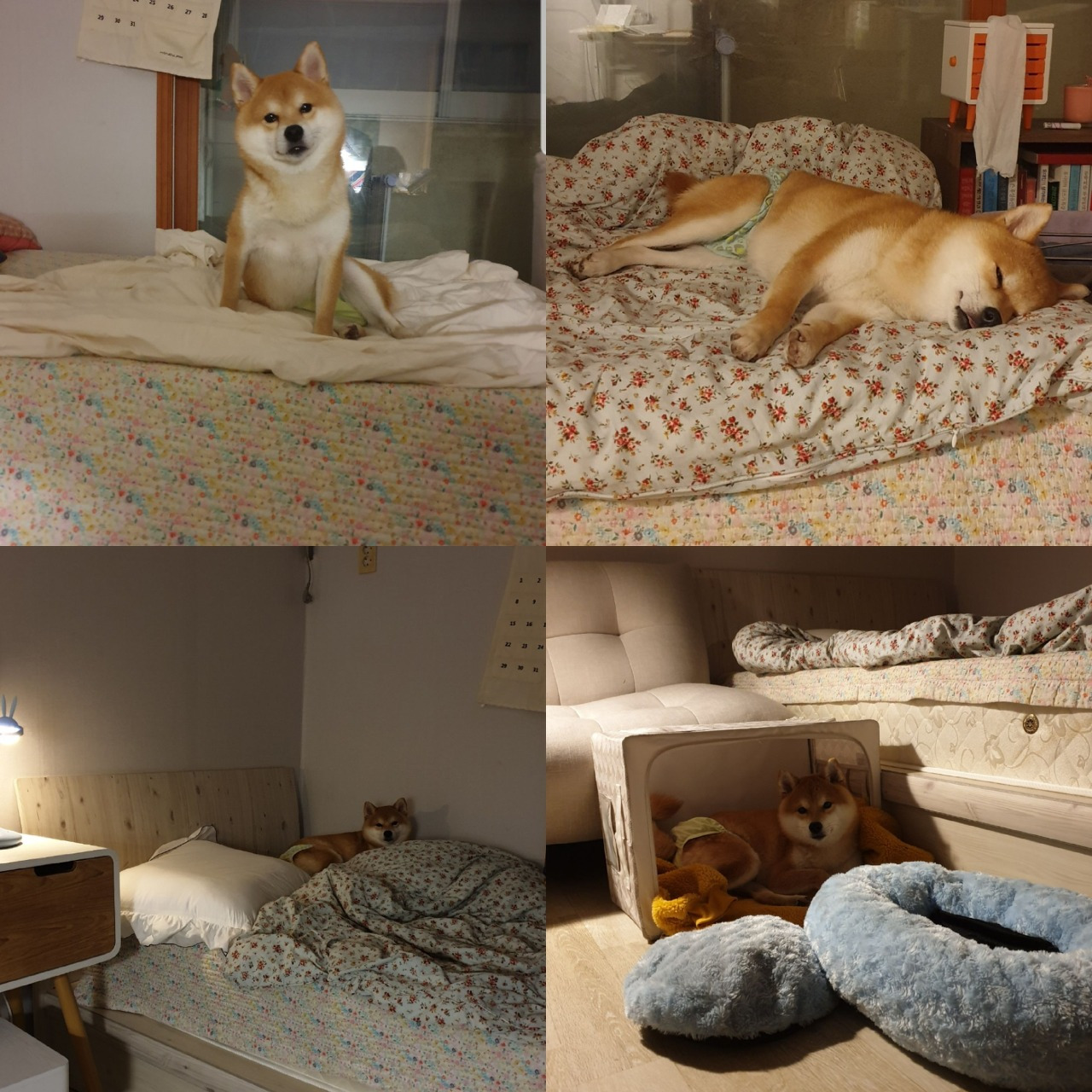 (방안으로 입성한 하쿠. 하쿠는 집도 많다. 쿠션 집, 상자 집, 침대 집)이라고 생각했으나 이 녀석, 무언가 저 딴에는 불편한 부분이 많았나 보다. 이번에는 실금이 문제가 아니었다. 하쿠가 방 안에서는 한 번도 정상적으로 오래 생활해본 적이 없어서 인지, 아니면 좁은 방 안에서 함께 지내는 게 불편했는지, 무엇 때문이었는지는 모르겠다. 여하튼 동거의 시작과 동시에 하쿠와 나 사이에 묘한 심리전이 시작되었다. 결국 나는 나의 침대까지 하쿠에게 내어주고 말았는데, 그러자 실내에서는 소변을 안 하던 녀석이 밤이 되어 침대만 올라가면 지도를 한바탕 그려놓는 게 아닌가? 산책을 막 갔다 온 직후에도 이 기이한 행동은 계속되었다. 그리고 그렇게 지도를 그려놓고는 반항이라도 하는 듯 나를 빤히 쳐다보는 것이었다.