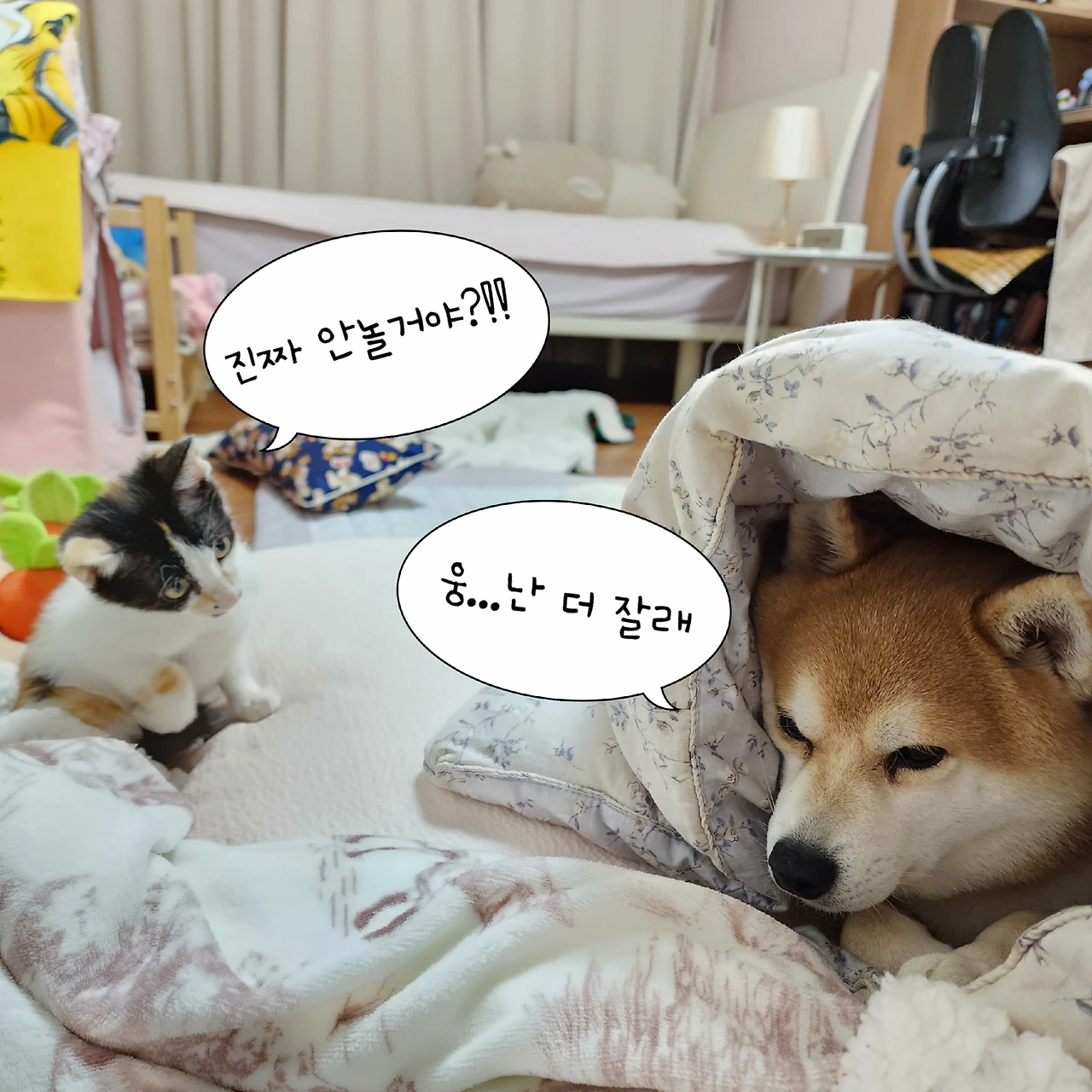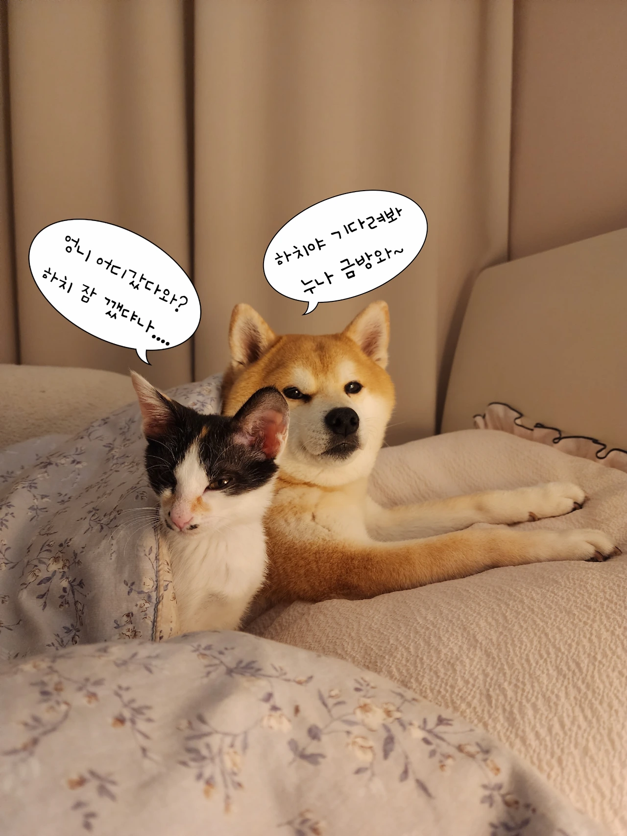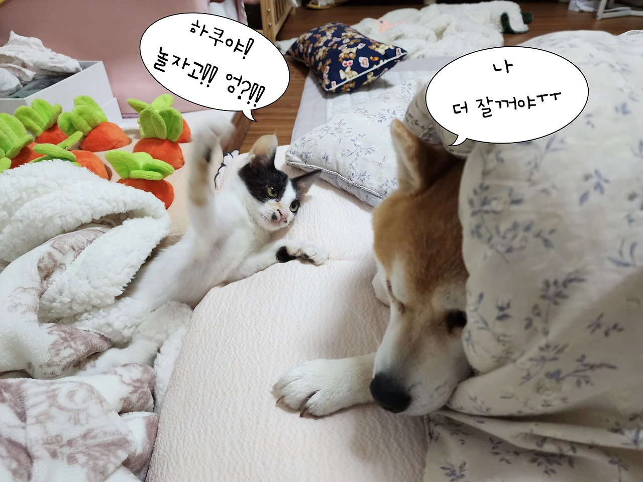 갑자기 어느 하루는 눈이 펑펑 내리더니, 병원을 찾는 환자도 일시적으로 줄었다. 나 또한 퇴근 직후에는 하쿠와 하치와 방안에 쏙 들어가서 새로 산 스피커를 틀어놓은 채, 몸과 마음을 녹이는 게 제일 행복한 일상이 되었다. 작은 공간에 세명(? 두 마리와 한 명?)이 복닥복닥 지내다 보니 하쿠와 하치의 모습이 눈에 더 잘 들어온다. 서로를 귀찮아하면서도 항상 서로를 궁금해하는 것을 지켜보는 게 귀엽다.