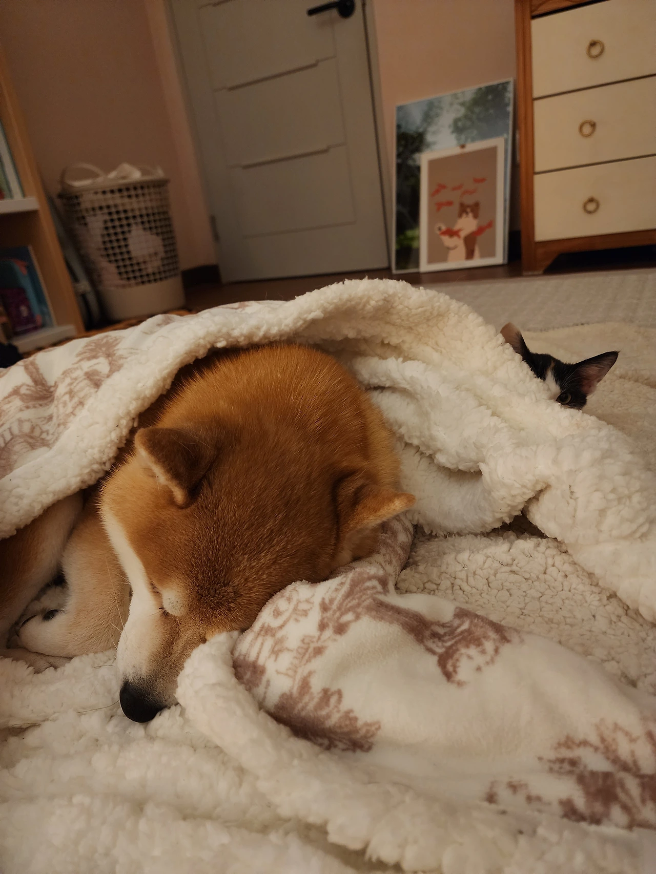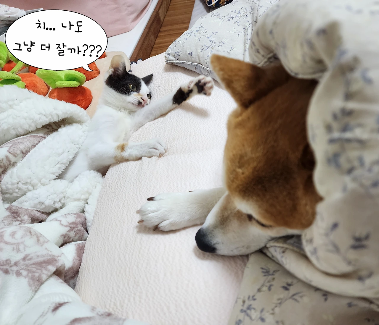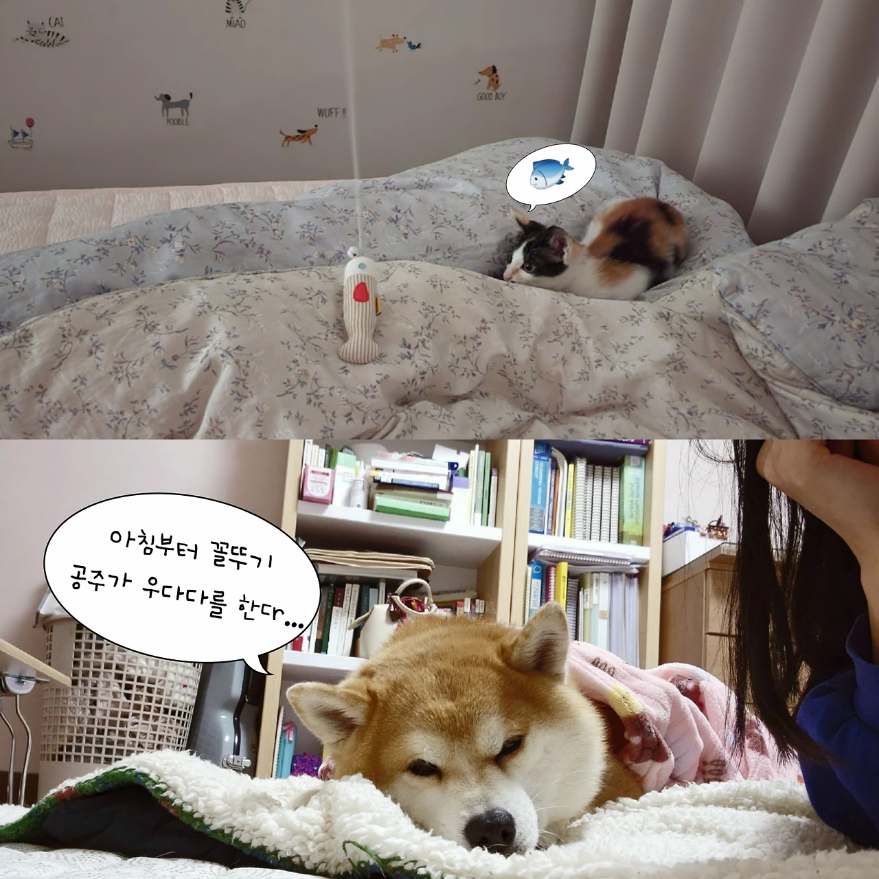 갑자기 어느 하루는 눈이 펑펑 내리더니, 병원을 찾는 환자도 일시적으로 줄었다. 나 또한 퇴근 직후에는 하쿠와 하치와 방안에 쏙 들어가서 새로 산 스피커를 틀어놓은 채, 몸과 마음을 녹이는 게 제일 행복한 일상이 되었다. 작은 공간에 세명(? 두 마리와 한 명?)이 복닥복닥 지내다 보니 하쿠와 하치의 모습이 눈에 더 잘 들어온다. 서로를 귀찮아하면서도 항상 서로를 궁금해하는 것을 지켜보는 게 귀엽다.