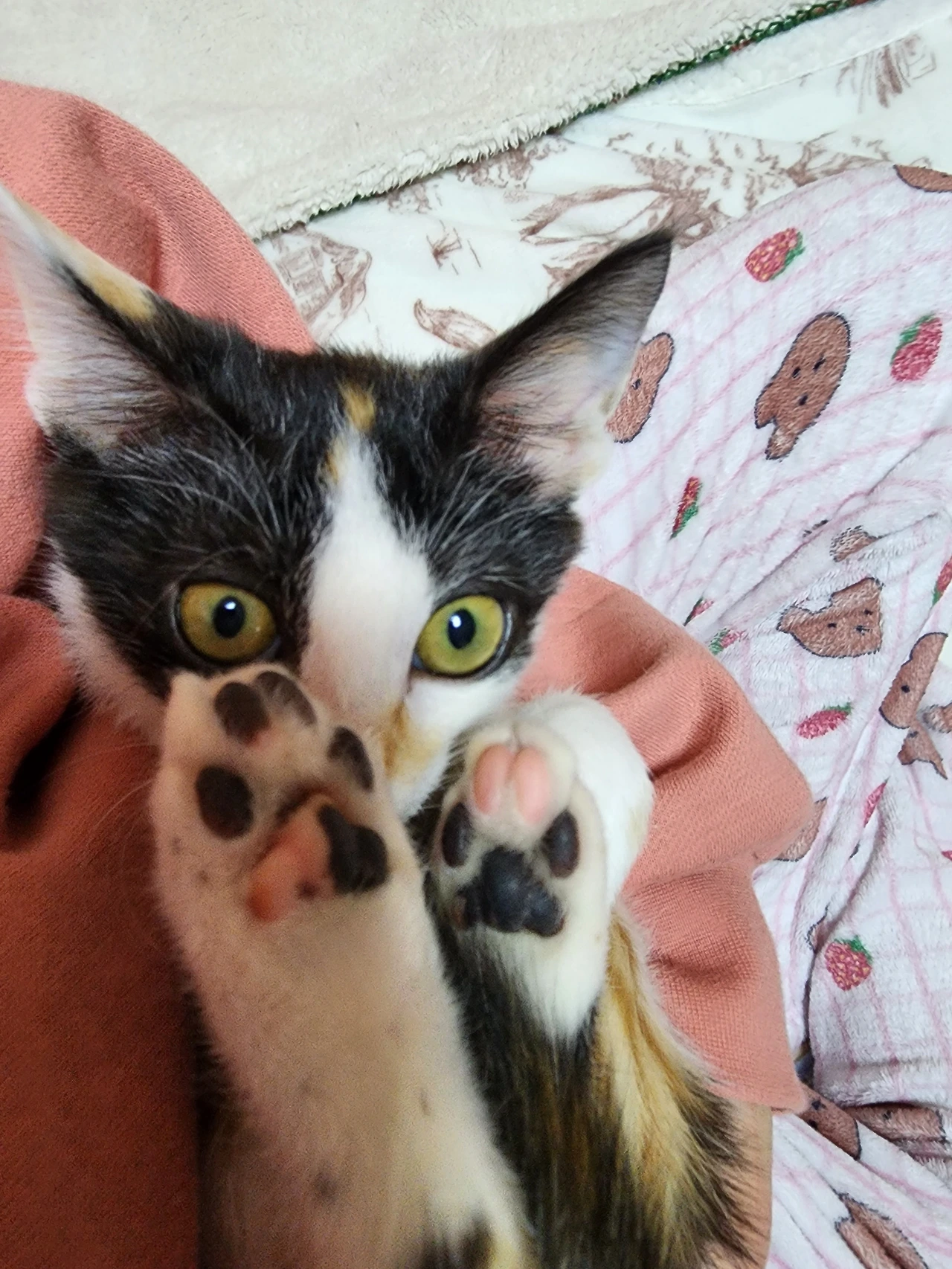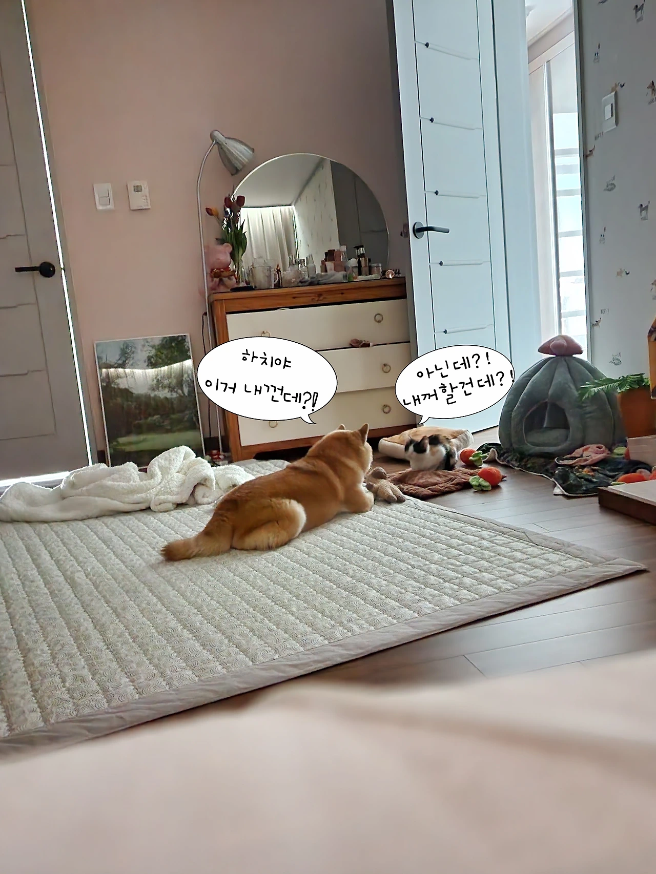 어느 아침에는 눈을 떴는데 하쿠와 하치가 작은 인형을 서로 주거니 받거니 하고 있었다. 하치는 애교도 많지만 질투도 욕심도 많은 아가다. 하쿠는 착해서 그런 하치를 잘 받아주지만 기린인형은 하쿠도 내심 아까웠나 보다.