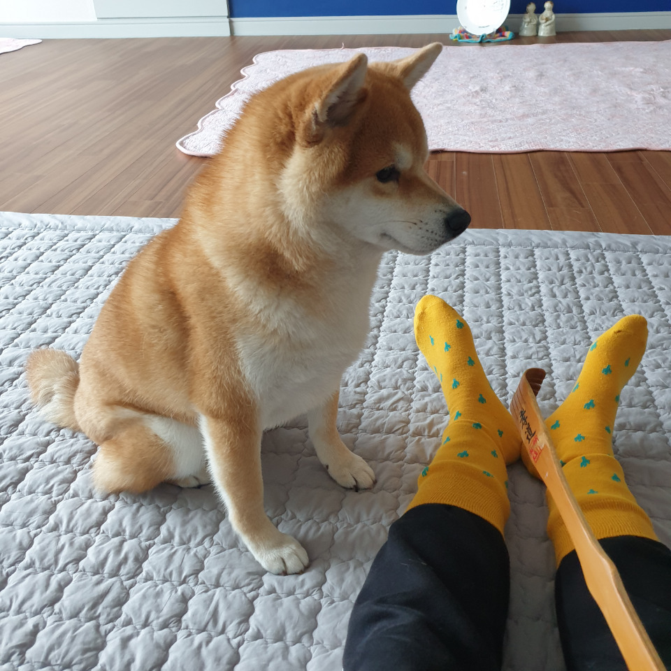 하도 양말을 뺏어가서 긴 양말을 신고 효자손으로 교육 중. 개춘기가 왔는지 1도 안 듣고 멍 때리는 게 분명하다.''하~머라는 거야~좀 따 뺏어가지'하는 표정. 양말이 무색ㅠ
