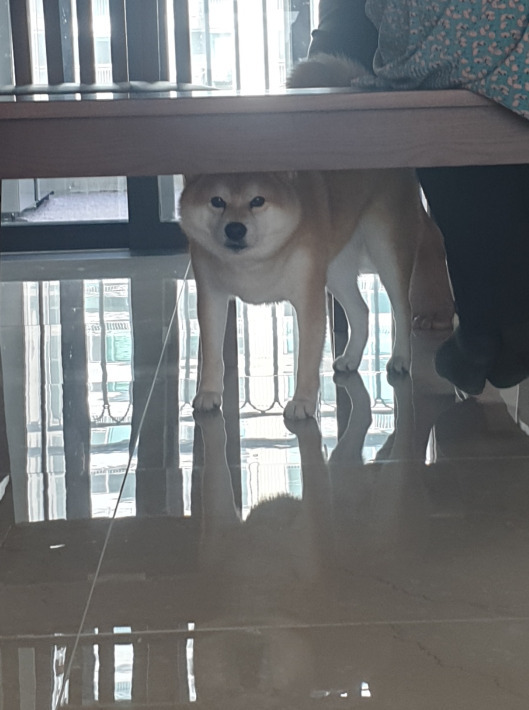 엄마 아빠 식사하시는 식탁 밑으로 들어가서 노는 쿠. 불러도 귀찮은지 오지 않고 고개만 빼꼼히 내어본다. 말 잘 안 듣는 장난꾸러기.
