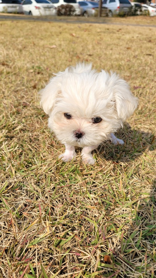 하쿠처럼 선천성 무 항문증에 괄약근(예후 판단에 중요한)이 거의 없는 아기 몰티즈. 거의 자기 몸만 한 넥 카라를 하고 아장아장 걷는, 겨우 손바닥 크기의 2달 아기 강아지.