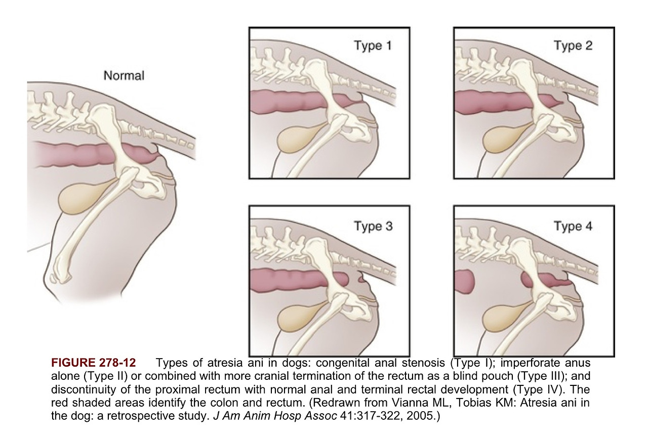 소동물에서 가장 흔하게 나타나는 직장-항문 기형(개에서 유병률 ≒ 0.007%)
