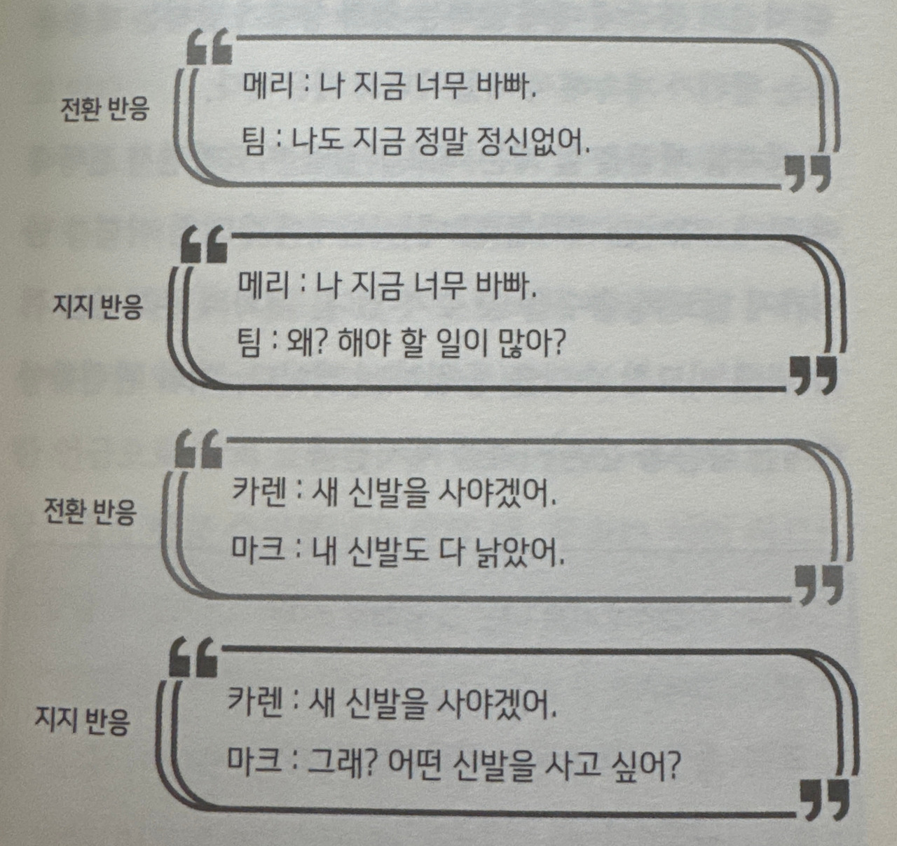 최근 한 협력사의 국장님과 식사 자리에서, 국장님은 이번 프로젝트 추진 배경을 브리핑하신 뒤, 인생 선배로서 결혼 관련 조언과 직장 리더십 팁까지 끊임없이 공유해 주셨습니다. (‘지지 반응’으로 호응하며 경청하니, 그날 국장님은 자연스럽게 훌륭한 리더로 인정받으셨고 다음 만남도 기대되는 관계로 발전하게 되었습니다.)