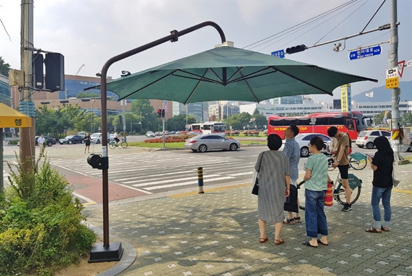 창원시 건널목에 설치된 파라솔 그늘막(ⓒ창원시청 2018.07.23, 오마이뉴스) 전국적으로 설치된 횡단보도 파라솔 그늘막은 누구라도 무릎을 탁 하고 치게 하는 좋은 행정의 표본입니다. 특히, 햇빛으로 인한 자외선은 피부는 물론이고 남녀노소를 떠나서 너무 힘듭니다. 지구온난화는 봄, 가을을 줄여나가고 있어 긴 여름과 긴 겨울을 살아가야 하는 현대인들에게 그늘은 필수적인 여름 피난처라는 생각입니다. 문제는 이런 솔루션이 건널목에만 고정 설치되어 있다는 것입니다.
