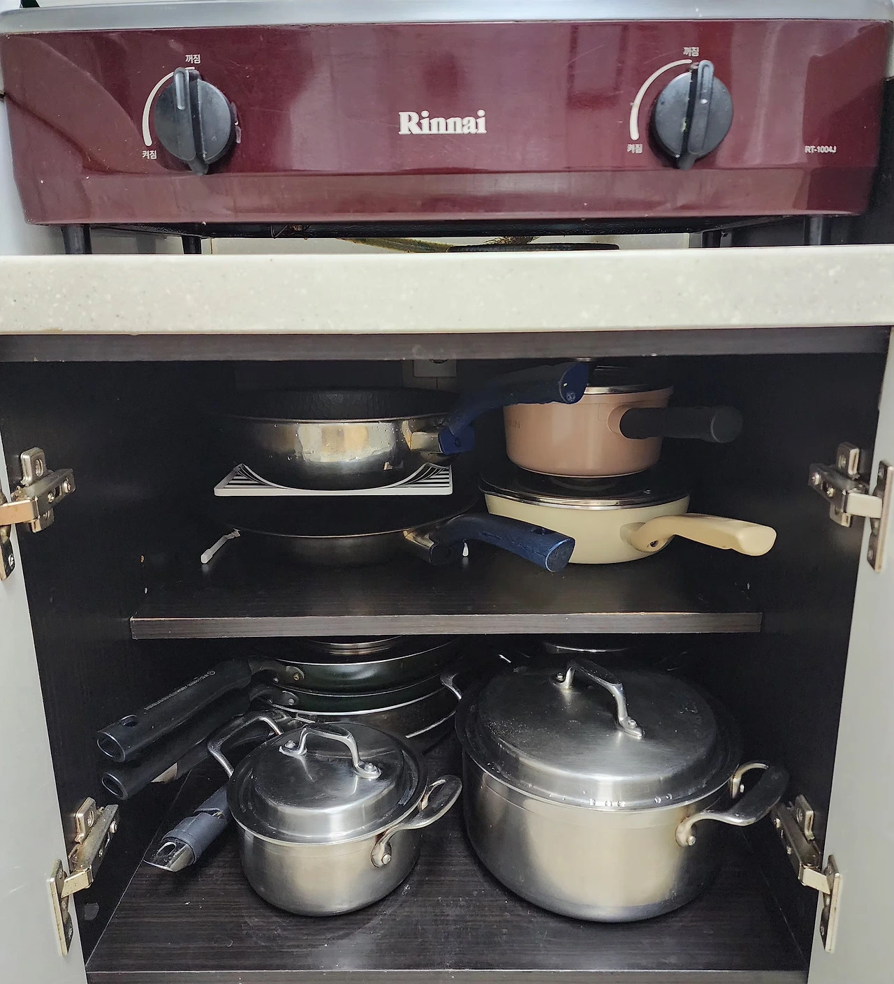 가열대 아래 싱크대는 자주 사용하는 국냄비 프라이팬 궁중팬을 두어야 조금이라도 동선을 줄이고 무게에 대한 수고를 덜 수 있다.