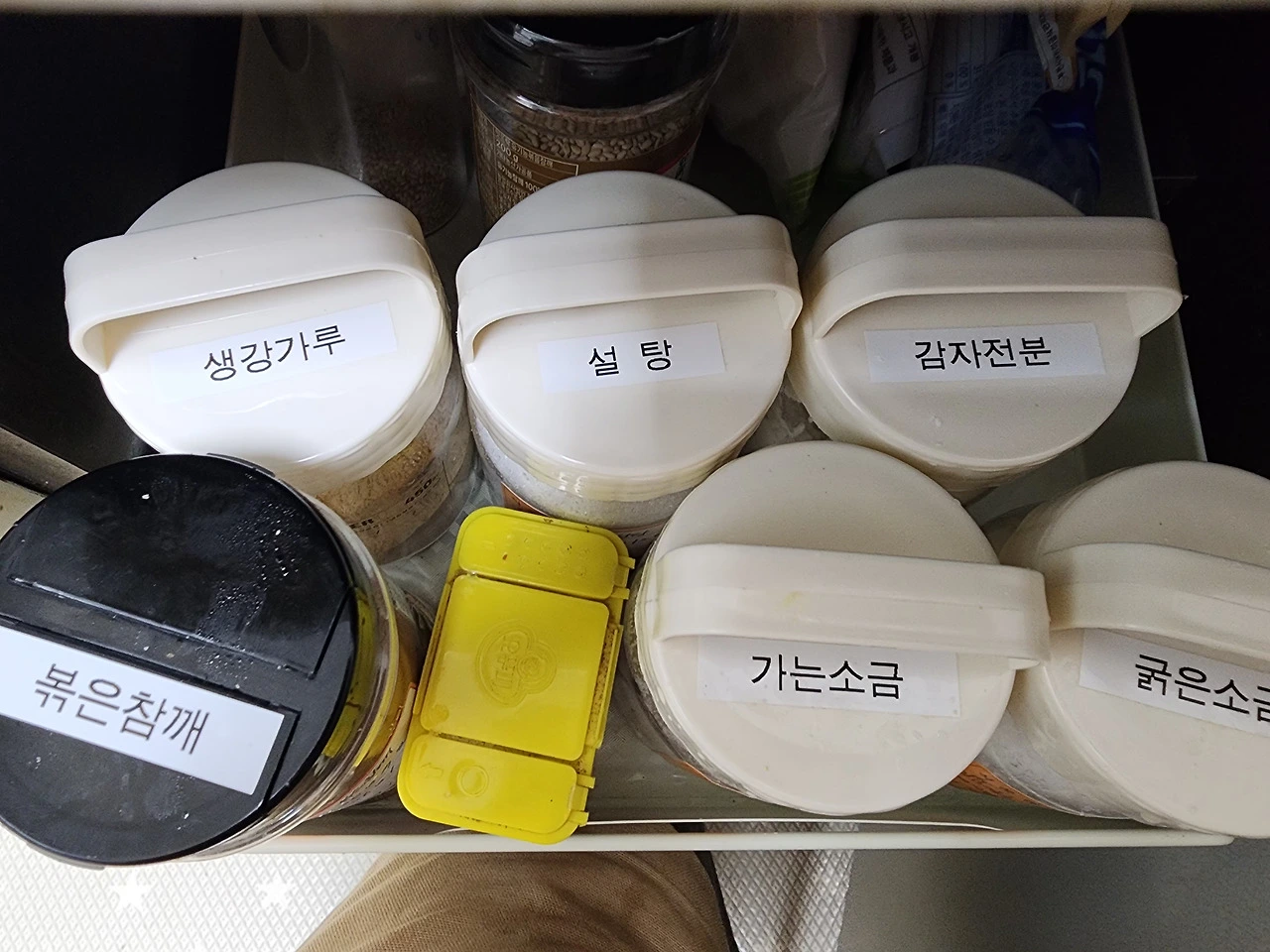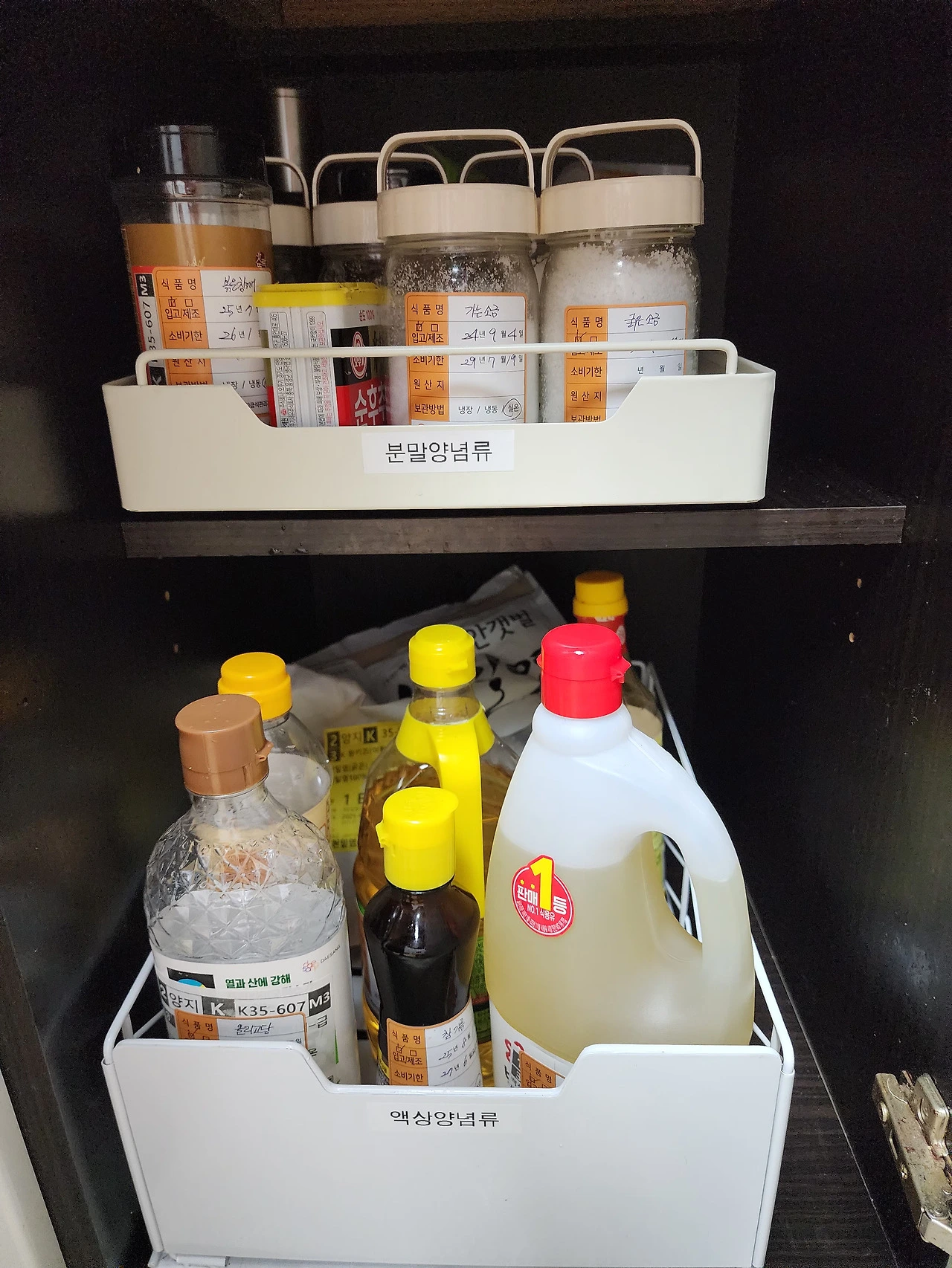 실온보관 양념은 그 종류가 많고 소금부터 식용유까지 용기의 크기가 다양하여 상부장보다는 하부의 서랍형태에 두는 것이 좋다.