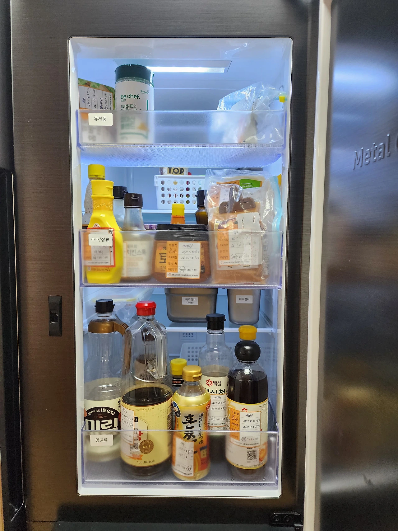 푸드쇼케이스에 자주 쓰는 냉장보관 양념을 두면 수고를 조금 더 덜 수 있다.