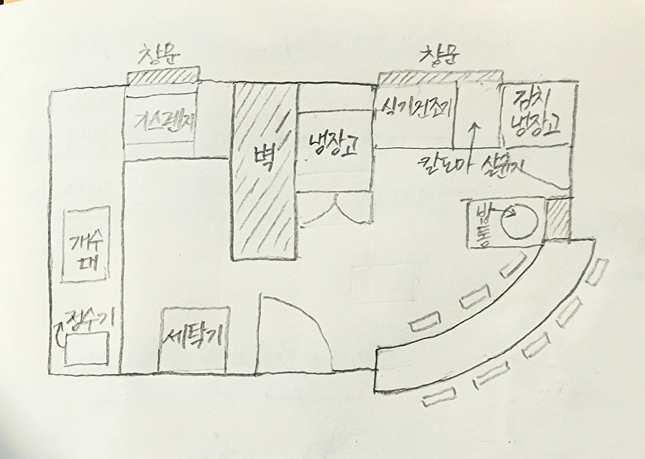 냉장보관 양념이 있는 냉장고의 위치가 가열대와 너무 먼 것이 이곳 주방의 문제 중 하나였는데, 마주 보고 있던 냉장고 방향을 돌여서 그나마 동선을 줄였다.