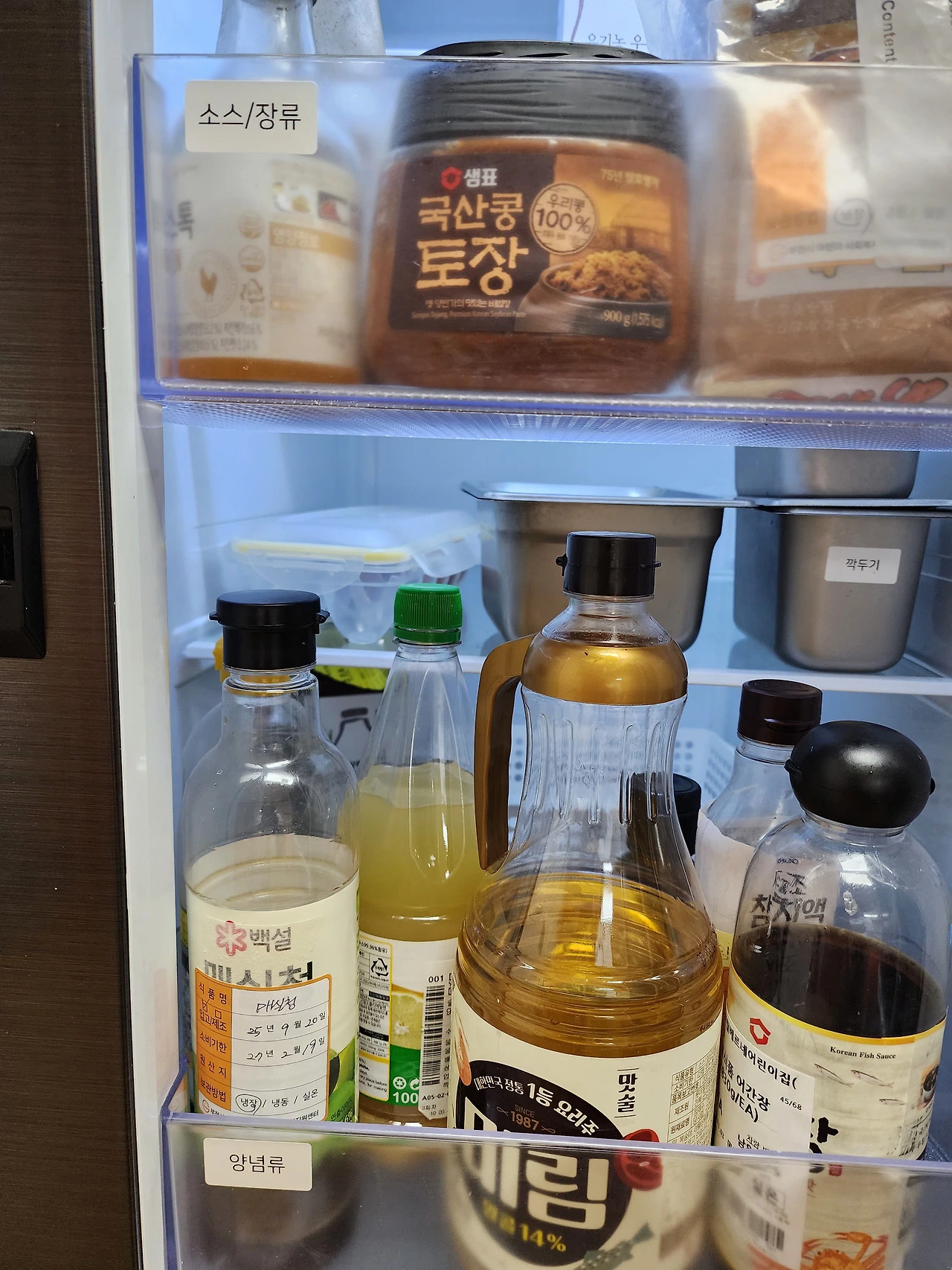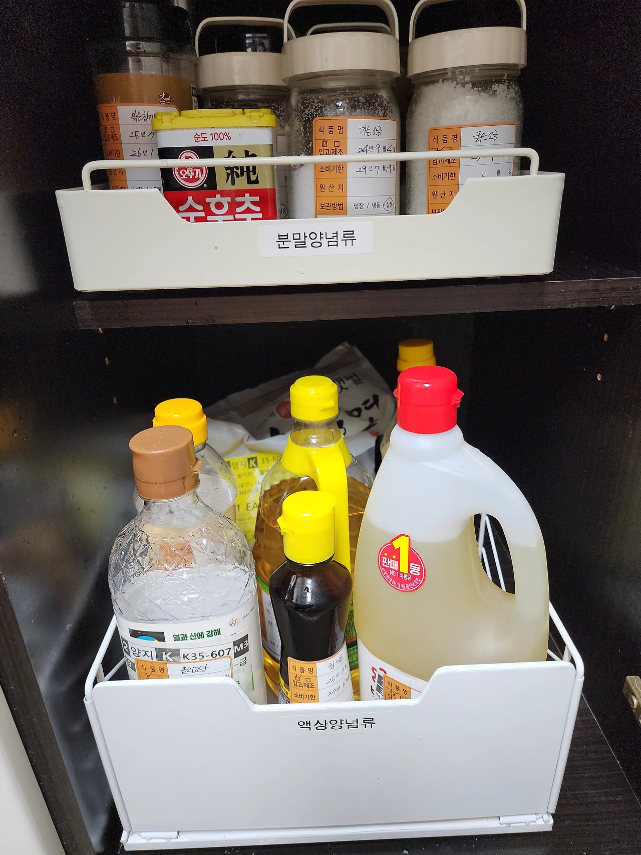 하부 싱크대에는 분말양념, 액상양념으로 분류하고 라벨링을 하였다.