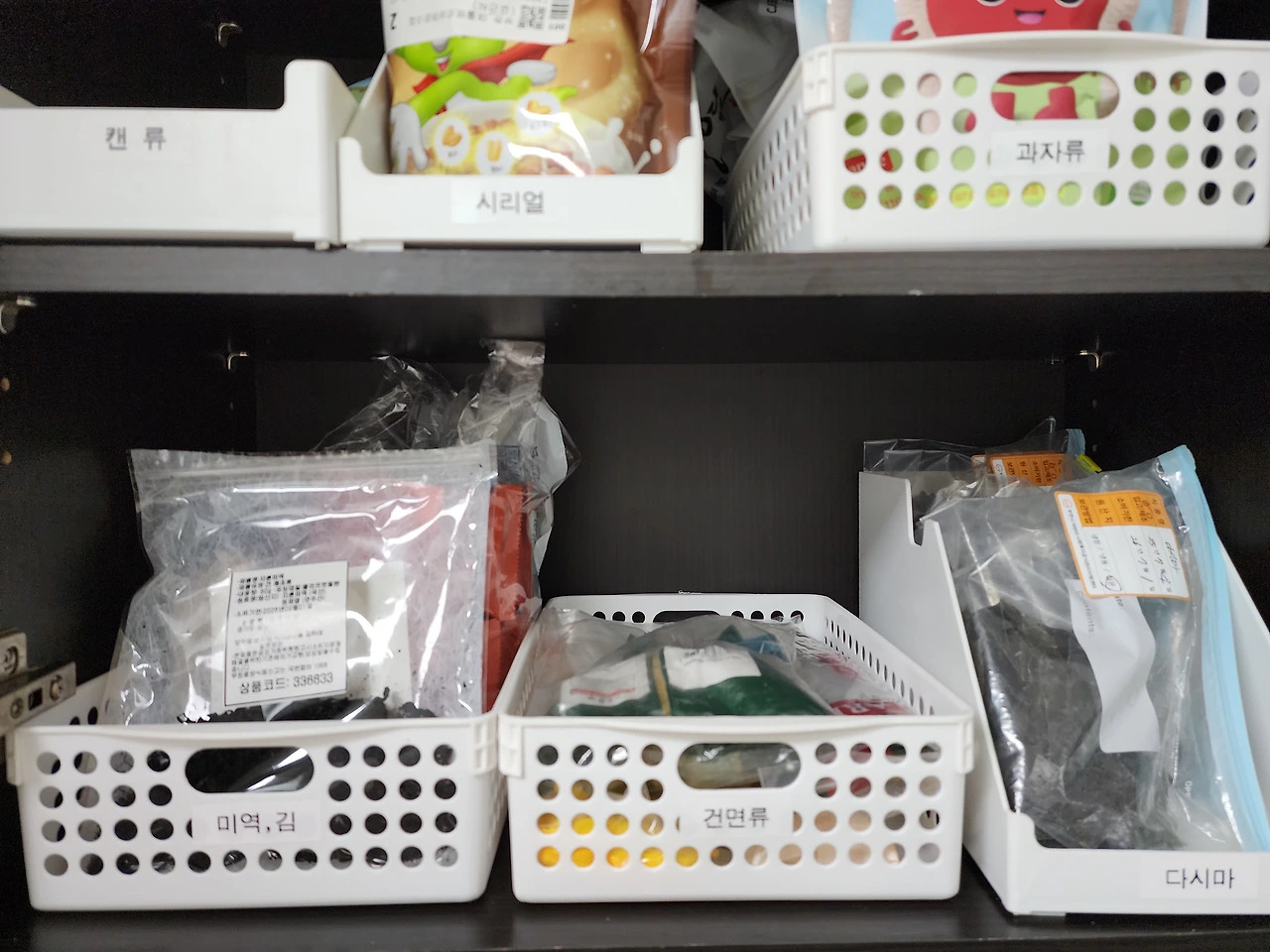 싱크대의 수납장은 바구니로 식재료를 나누고 라벨링을 하는 것이 좋다.