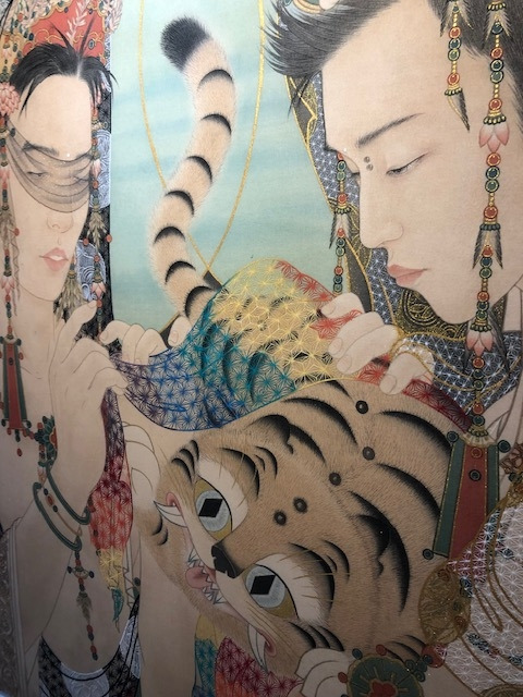 그날 1층과 지하1층에서는 브리타니 패닝 (Brittany Fanning)의 작품이 전시 중이었다. 선명한 색의 대비와 테두리 선은 만화 같은 느낌을 주고, 인물들의 옷에 놓은 자수가 입체감을 살려준다. 특이한 건 의상과 배경은 화려하지만, 인물들의 얼굴이 보이지 않는다는 것이다. 작가는 의도적으로 얼굴을 헬멧으로 가리거나, 뒤를 보거나, 아예 화면 밖으로 얼굴을 자르고 목 아래만 그리고 있다.