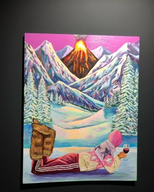 ‘The whipped cream daydream’ 이라는 작품을 본다. 한 젊은 여성이 푹신해 보이는 카펫 위에 배를 깔고 누워 와인잔을 들고 있다. 하지만 여자가 쳐다보고 있는 창 밖으론 화산이 폭발하고 있다. 지극히 개인적인 일에만 관심을 두는 현대인들이 자연 재해 같은 외적인 일에는 방관자 적인 점을 비판하는 것일까?