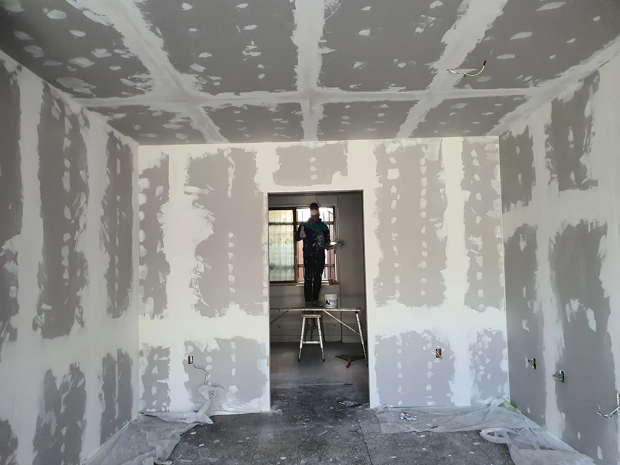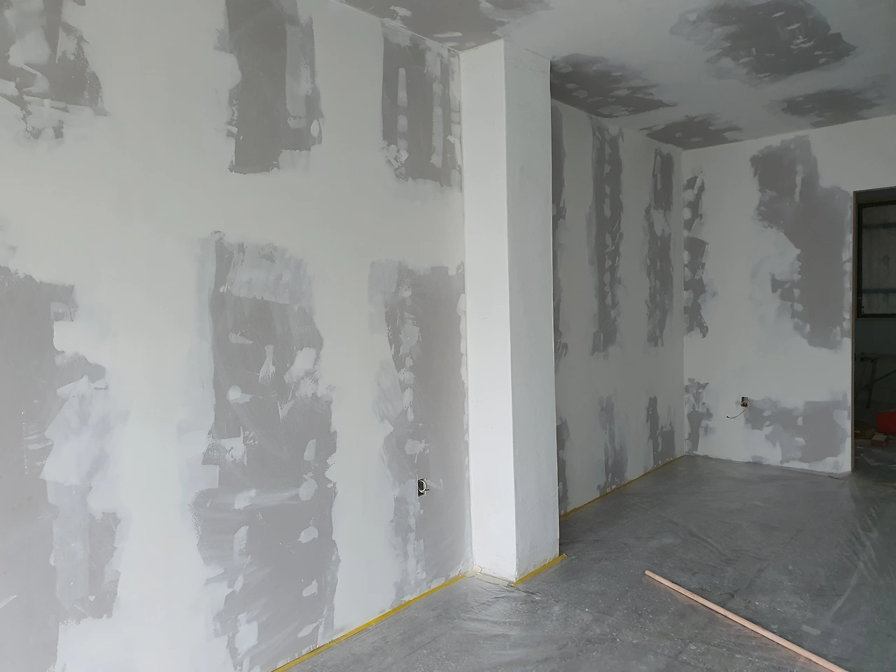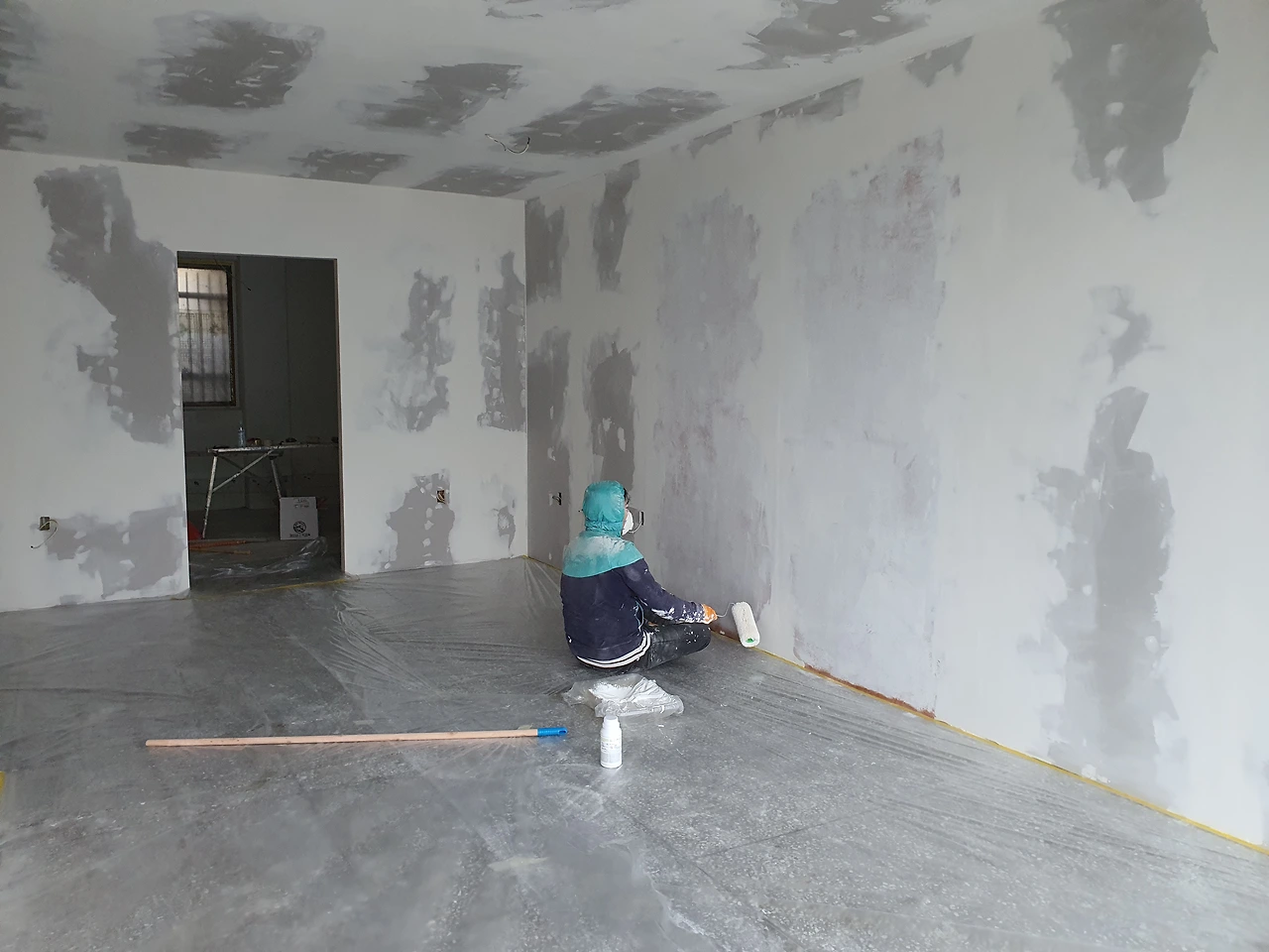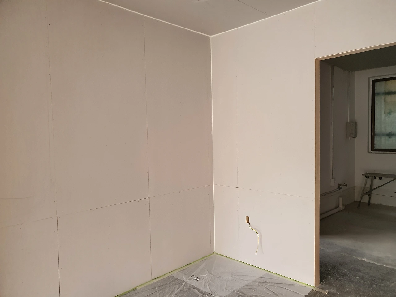석고보드를 이용해 벽과 천장 마감을 진행했다. 석고보드 위에 바로 페인트를 칠해도 되지만 석고보드 간 이음새 또는 타카 자국 때문에 벽면이 울퉁불퉁 이쁘지가 않다. 벽면을 평평하게 매끈하게 해 주기 위해 퍼티 작업이 필요하다.(한창 인기였던 노출 콘크리트 인테리어를 한다면 스킵 가능한 작업이다)