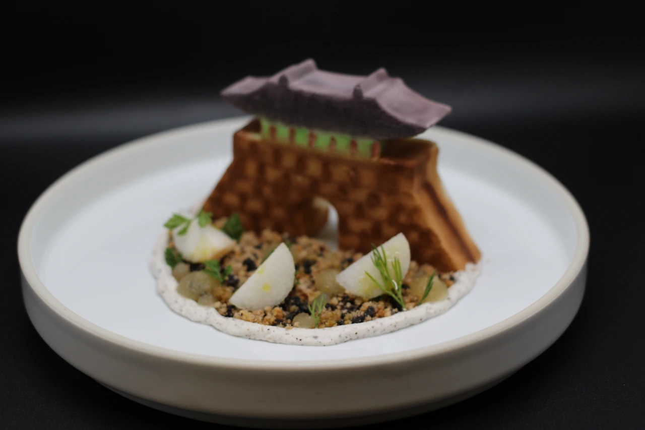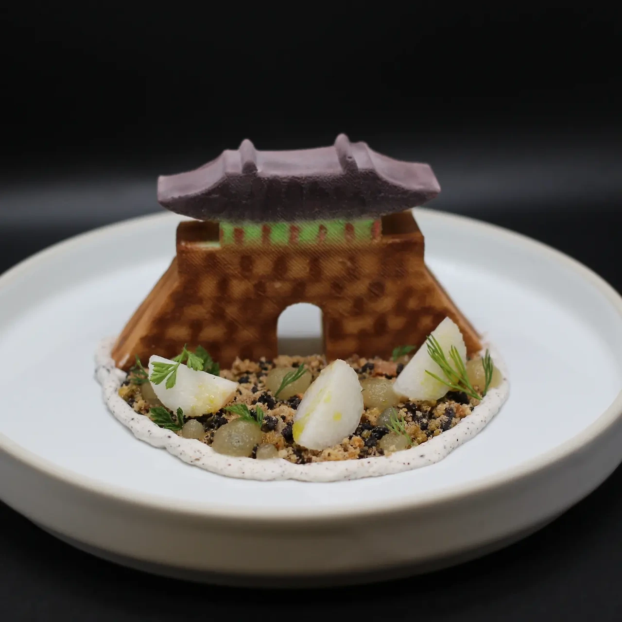 요리 크리에이터 '무토'와 콜라보한 디저트예요. 홍성쌀 젤라또가 조양문 모양으로 재탄생했어요. 무토팀의 플레이팅 작업이 들어가니 너무 멋진 모습이네요.