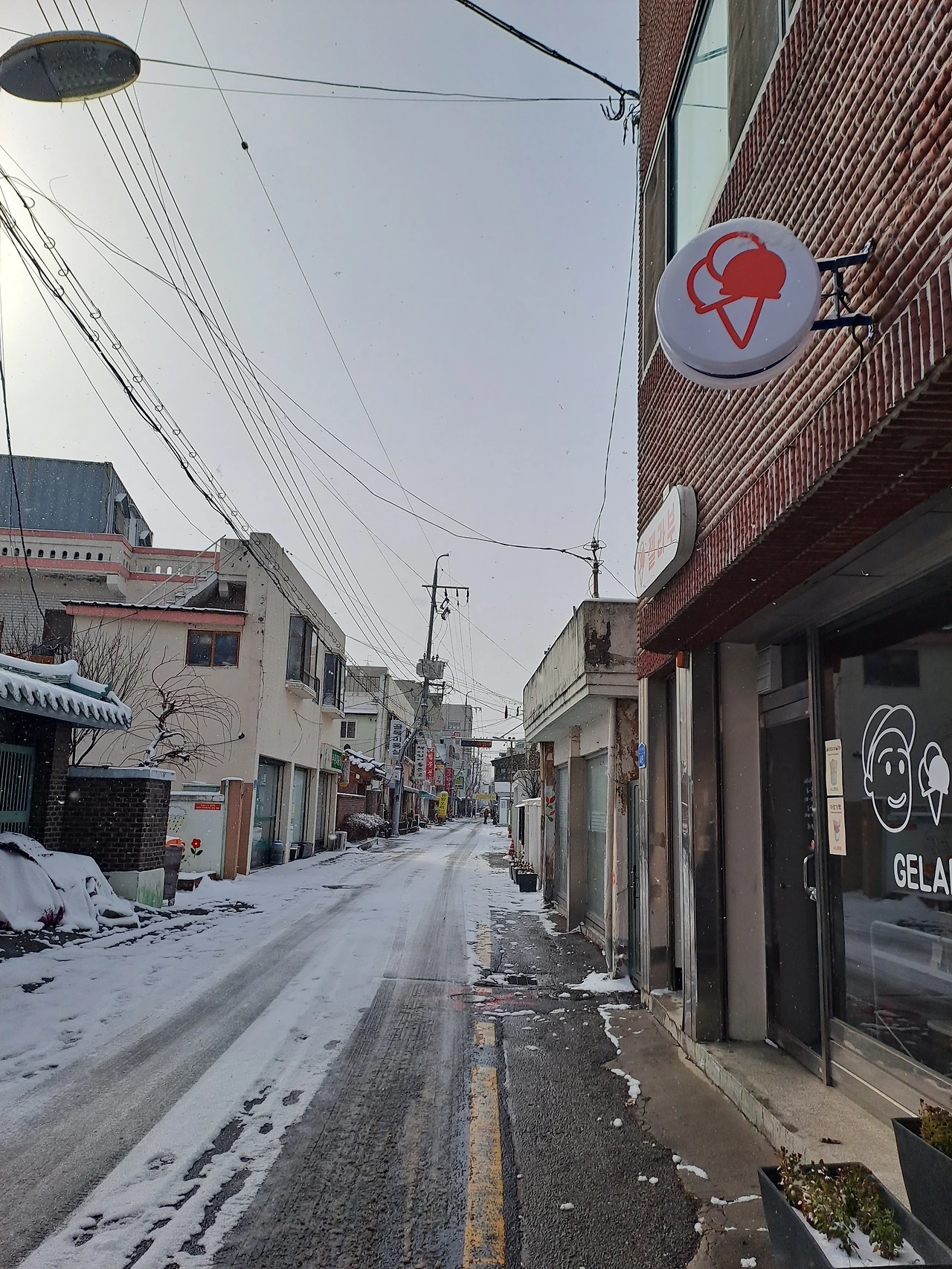 거대한 스노우볼 안에 있는 것처럼 새하얀 눈이 거리를 하얗게 덮었네요. 하얗게 눈 내리는 날 젤라부에서 눈 구경하며 젤라또 한 입 먹는 것, 겨울에만 느낄 수 있는 낭만이죠.