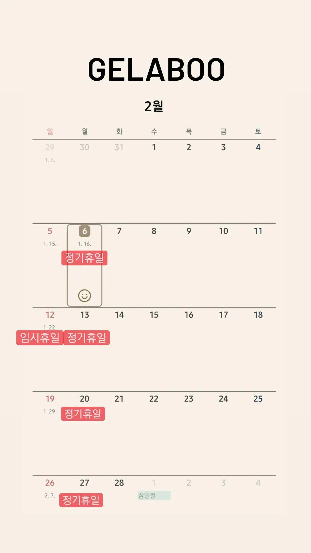 2월 12일 일요일은 가족행사가 있어서 서울에 다녀올 예정이에요. 설에도 인사를 못 드려서 젤라부 하루 쉬어가게 됐어요. 가족들과 즐거운 시간 보내고 에너지 충전해서 돌아올게요.