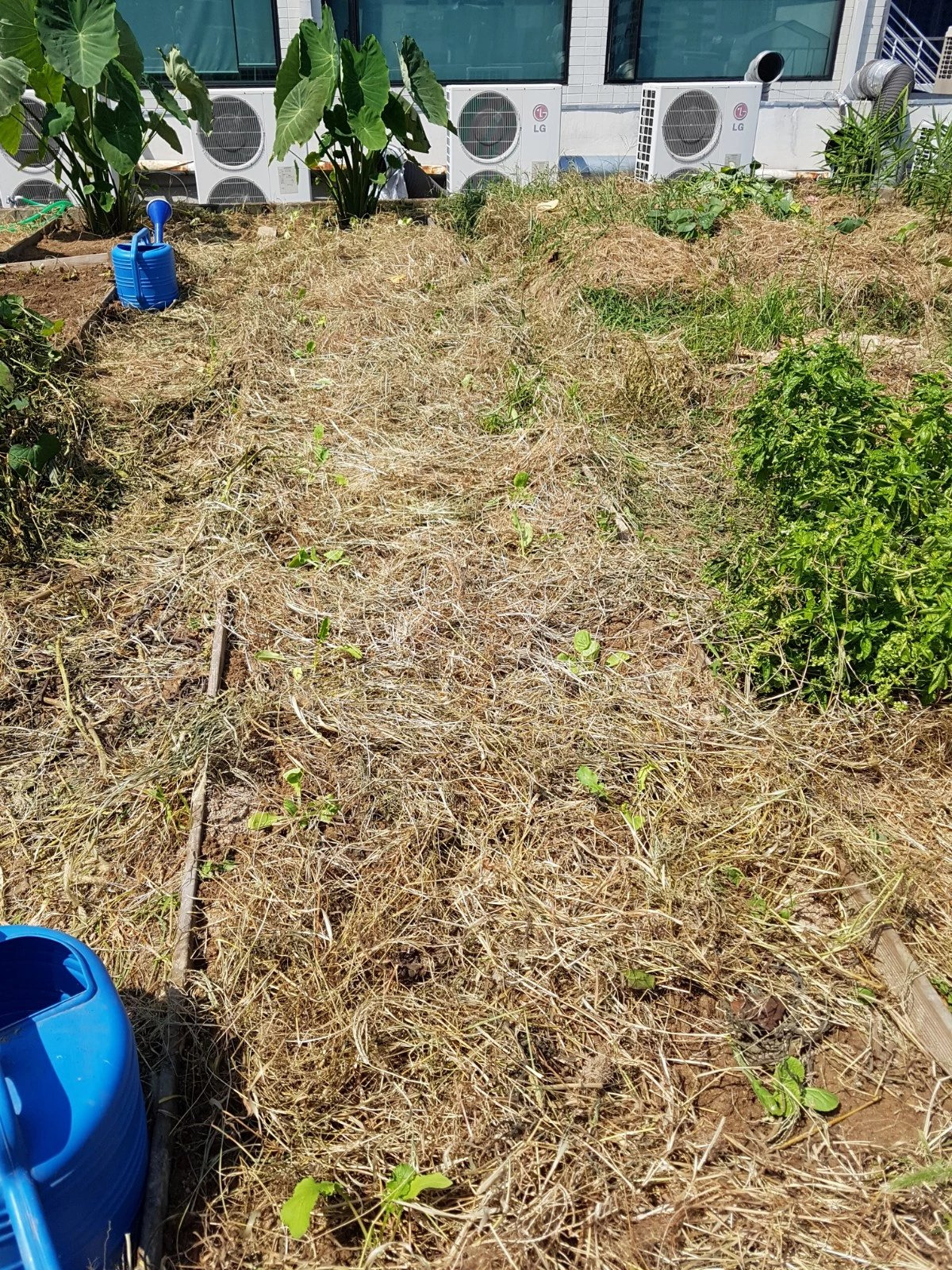 씨를 심은 텃밭의 경우 질긴 풀로 멀칭을 해주면 새싹이 뚫고 올라나오지 않기 때문에 풀 대신에 신문지를 위에 덮어주고 물로 촉촉하게 적셔주는 것이 노하우라고 합니다. 1주~2주 정도 지나면 씨앗이 나오게 되는데, 작물이 자리를 잡게 되면 신문지 대신 풀로 멀칭을 바꿔주면 됩니다.