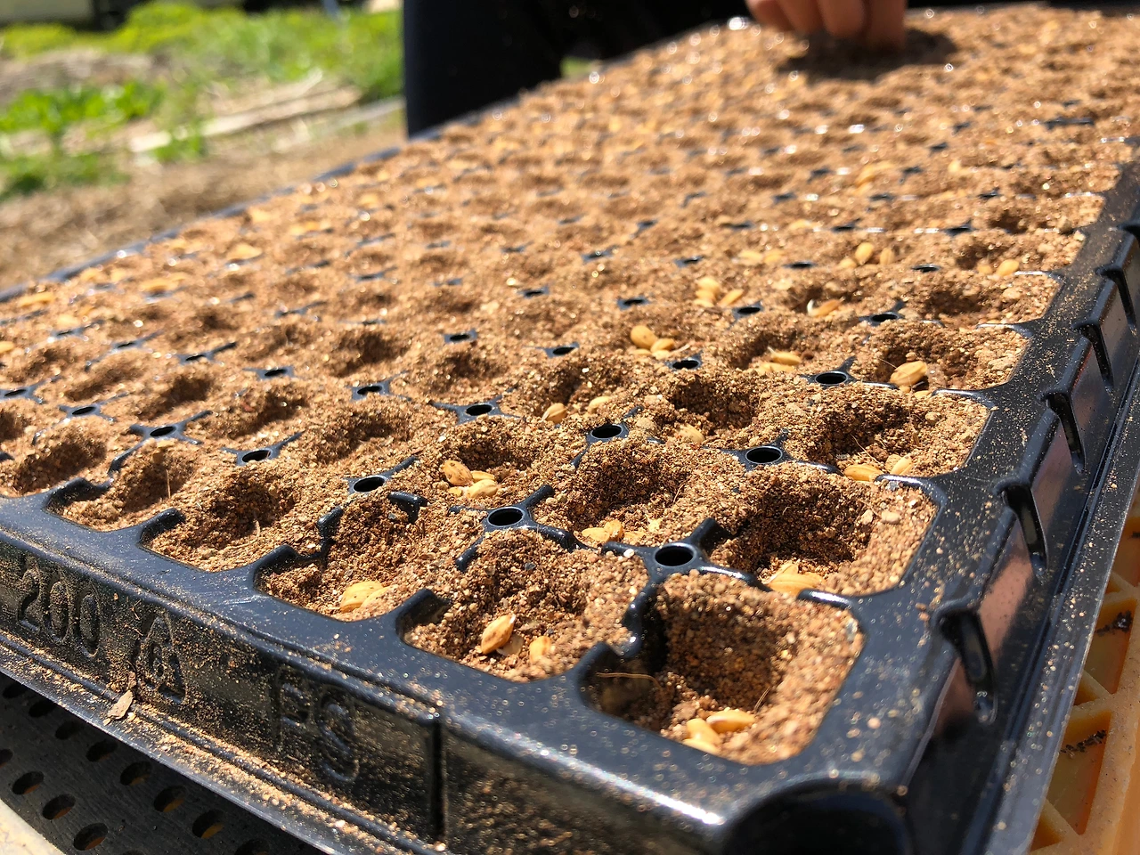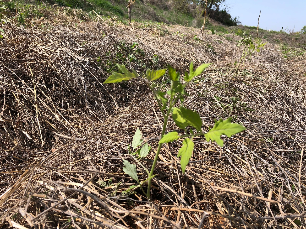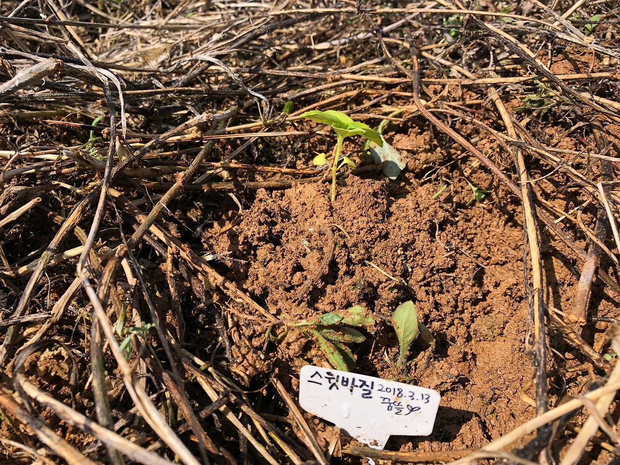작년에 자랐던 옥수수대와 건초를 살짝 걷어내고 호미로 한 번 찍어주고 물로 흙을 충분히 적셔준다. 그리고 모종으로 옮겨 심고, “잘 자라주라”는 말과 함께 흙을 다독여줬다.