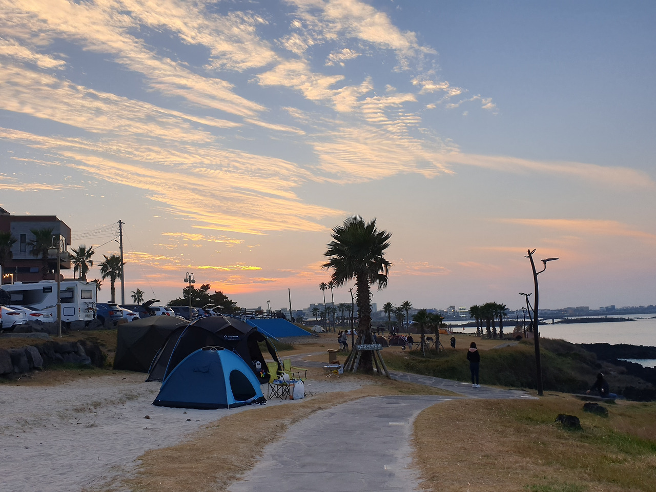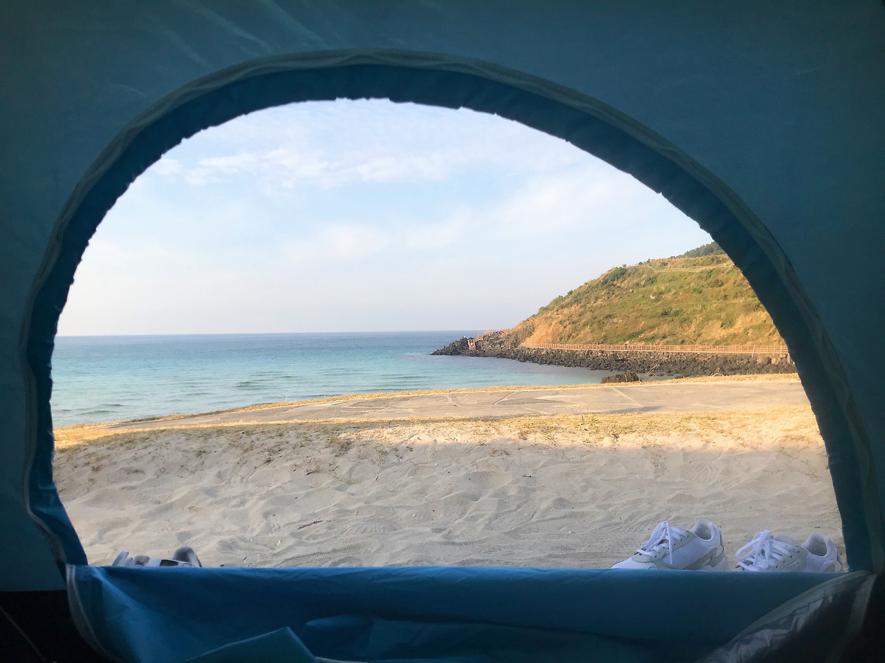 텐트 안에서 보이는 바다는 밖에서 보는 바다와는 또 달랐다. 텐트 문이 만들어 놓은 아치형의 바다 풍광을 보고 한참을 누워 있었다. 하늘과 바다와 백사장이 어우러져 아치형의 문 앞에서 넘실거렸다. 잔잔한 물에서 서핑을 하는 이들을 하염없이 보았다. 이내 우리가 자리 잡은 곳 주변으로 으리으리한 텐트가 자리했지만, 다음에 다시 원터치 텐트를 들고 함덕을 찾아야겠다 생각했다.