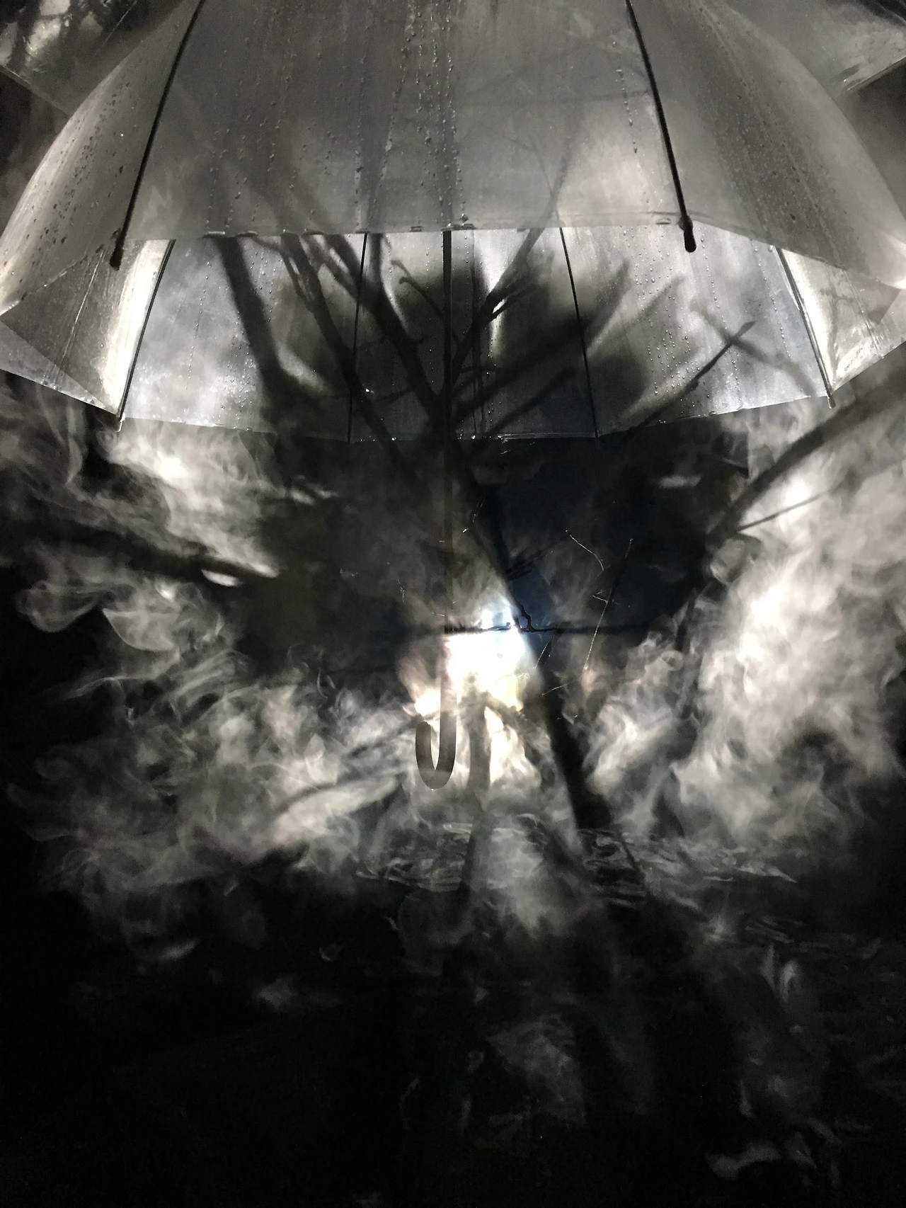 ‘안개란 투명한 물이 타고 남은 하얀 재. 타는 갈증을 못 풀어 애꿎은 물을 태우기로 한다.(작가의 전시소개 글 中)’라는 문구에서 알 수 있듯이 주요 작품은 안개설치작업이었다. 이미지는 안개의 움직임에 따라 차고 기울고 겹치고 가까워졌다 멀어지며 긴 파장의 노을처럼 늘어지기도 한다. 그 속에 유리 오브제들이 널려 있다. 건너편 공간에는 비닐우산 속 꺾어진 감나무 가지가 하얀 포말에 그림자를 길게 드리우고 있다. 뿐만 아니라 ‘물은 살아 있는 모든 것의 고향이리라.’라고 표현한 그는 유리를 고체 상태의 물로 비유했으며, 별도의 유리 오브제 작품들도 함께 선보였다.