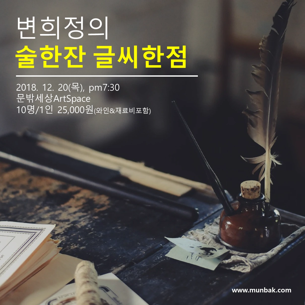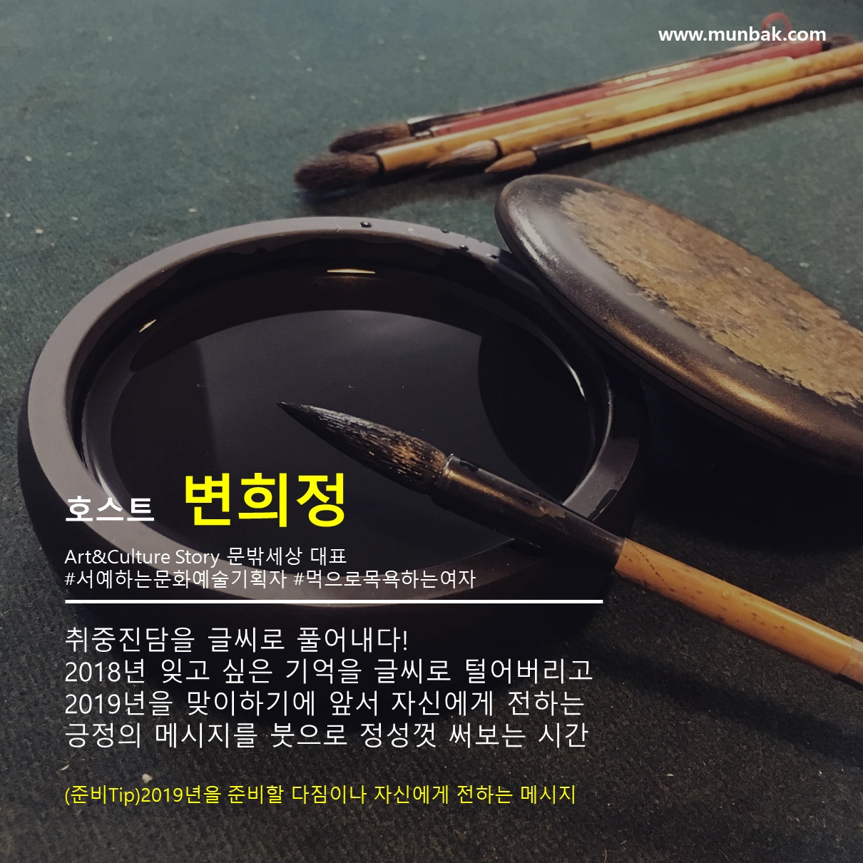 농담 삼아 하는 말, ‘주력이 필력이다’라는 소리를 별로 좋아하진 않아요. 하지만 이번엔 글씨를 술과 함께 써보고 싶어서 준비해봤습니다. 흔히 ‘취중진담(醉中眞談)’이라는 얘기들을 많이 하죠. 알딸딸한 술기운을 빌어 2018년에 있었던 잊고 싶은 기억을 글씨로 훌훌 털어내 버릴 수 있도록 도와줄게요. 그리고 2019년을 새롭게 맞이하기에 앞서 자신에게 전하는 긍정의 메시지를 붓으로 정성껏 써볼 거에요. ‘우린 아직 젊기에, 괜찮은 미래가 있기에~’ 버릴 건 버리고, 새로이 앞으로 나아가 보자고요.