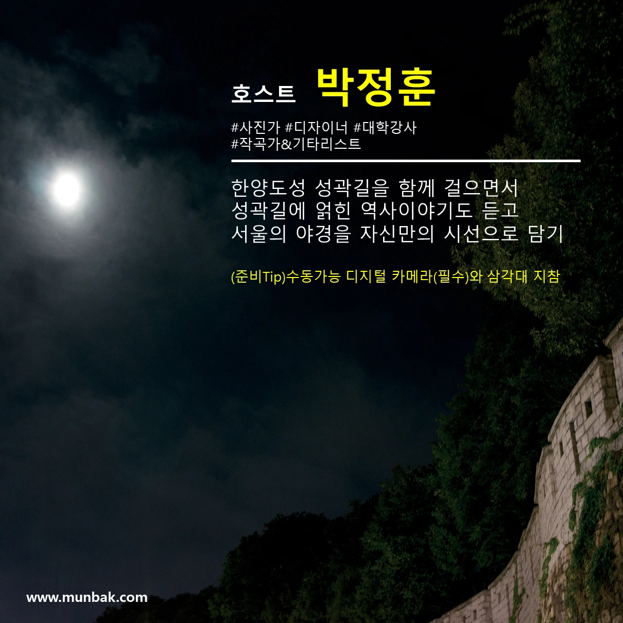 호스트인 박정훈 작가는 한양도성 아래에 거주합니다. 함께 성곽길을 따라 걸으면서 그가 전하는 한양도성 성곽길에 얽힌 역사 이야기도 듣고, 성곽 아래로 펼쳐진 서울의 야경을 자신만의 시선으로 카메라에 담아보는 시간입니다. 수동기능을 다루지 못해도 상관없습니다. 작가님이 다 알려줄 거니까요. 카메라가 어려워서 자동 찍기만을 시전하던 이들에겐 수동기능 작동법도 익히고, 서울의 멋진 야경을 직접 촬영해 볼 기회가 된다고 하니 함께 해보시는 건 어떨까요?