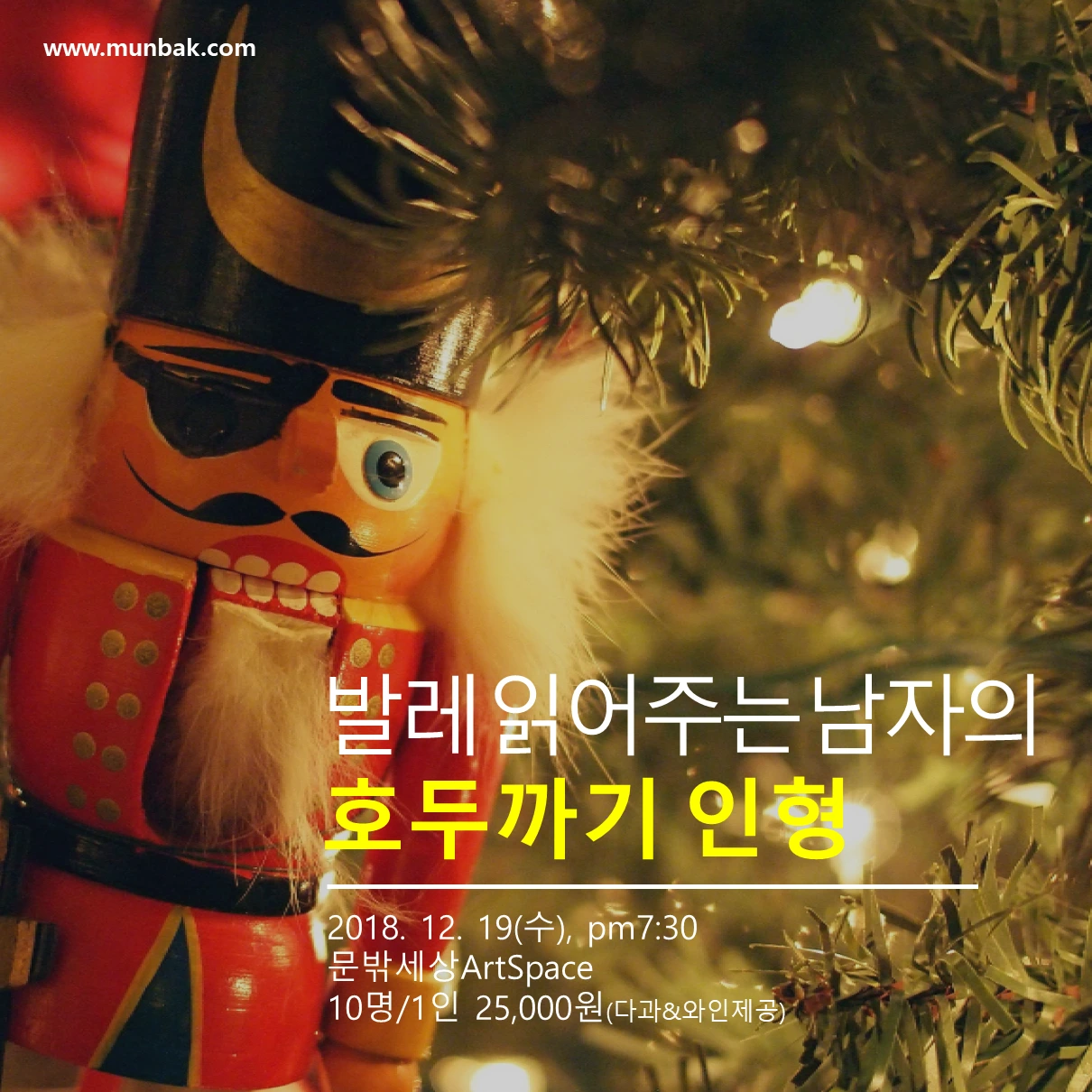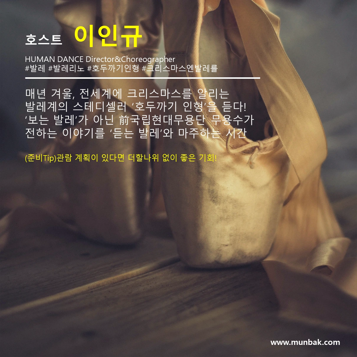 갖춰진 무대에서만 감상할 수 있는, 혹은 쉽게 범접할 수 없는 예술 장르라는 느낌이 강한 발레! 하지만 이번 크리스마스 예술상점의 '발레 읽어주는 남자 이인규'와 함께라면 발레에 대한 생각이 달라질지도 몰라요. 매년 겨울, 전 세계에 크리스마스를 알리는 발레계의 스테디셀러 ‘호두까기 인형’을 듣는 시간. ‘보는 발레’가 아닌 前국립현대무용단 무용수가 전하는 이야기를 ‘듣는 발레’와 마주하게 되는 새로운 경험을 하게 될 거에요.