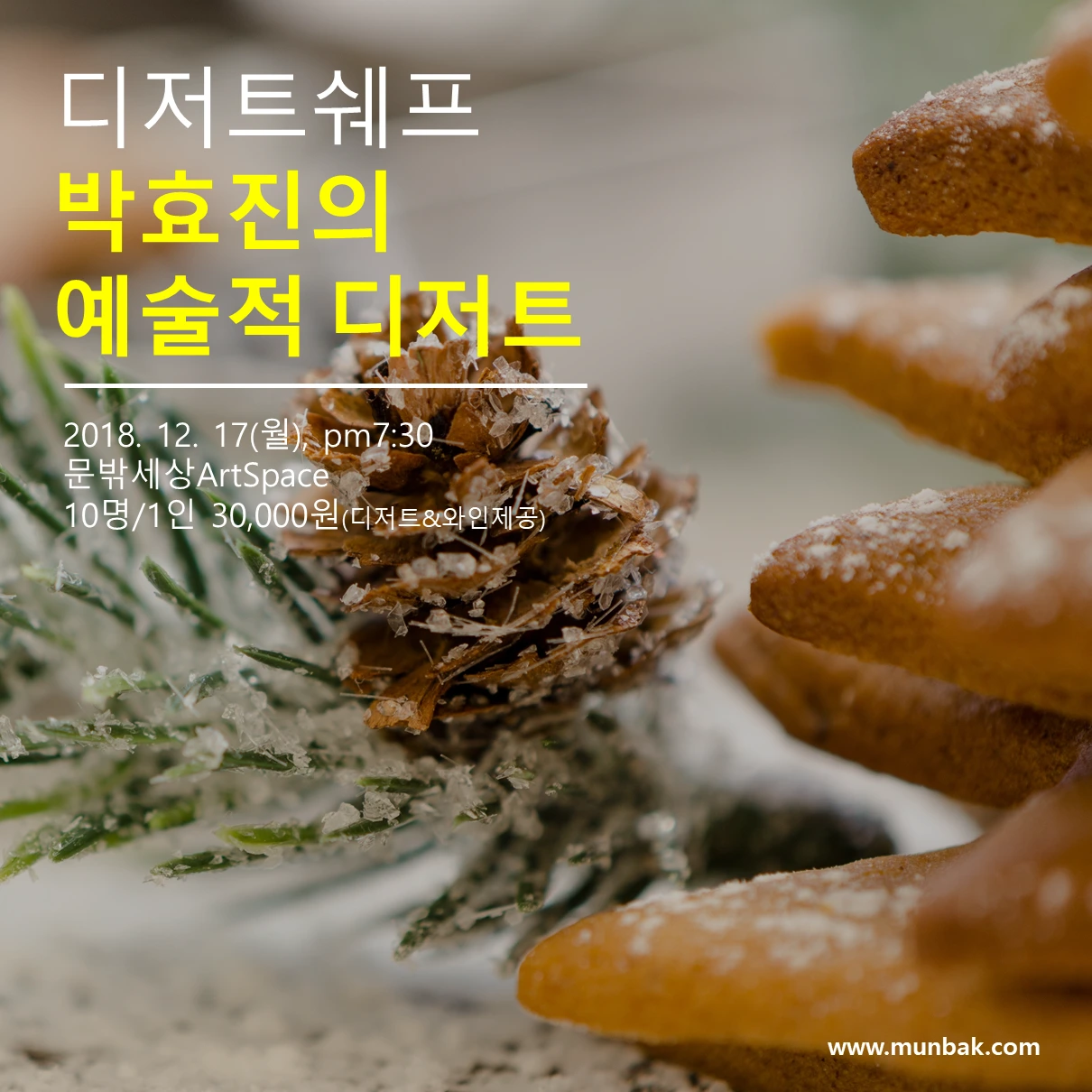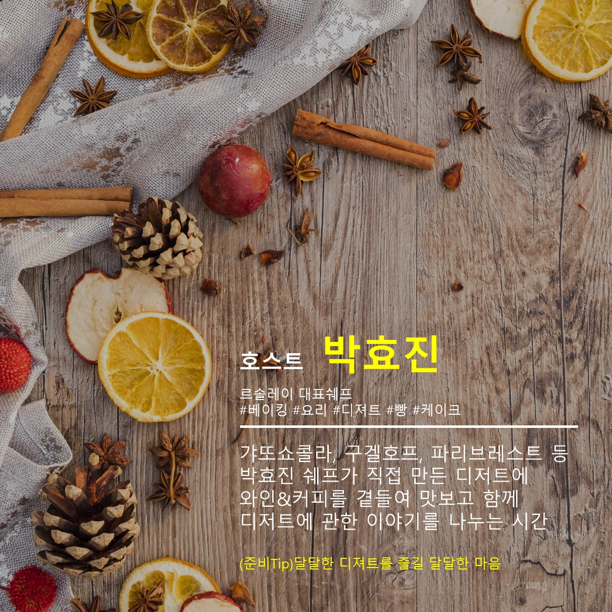 달콤한 디저트는 무엇? 바로 '사랑'이죠. 작고 예쁘고 달달한 디저트가 가져다주는 행복감이란 그 어떤 마법과도 비할 수 없는 황홀경을 선사합니다. 갸또쇼콜라, 구겔호프, 파리브레스트 등 박효진 쉐프가 직접 만든 디저트에 와인과 커피&차를 곁들여 맛보고 함께 디저트에 관한 이야기를 나누는 시간, 어디에도 없었던 그 시간 속으로 여러분을 초대합니다. 짧지만 달콤한 황홀경의 세계로 여행을 떠나고 싶은 분이라면 이 살롱을 선택해보세요. 절대 후회하지 않을 거랍니다!