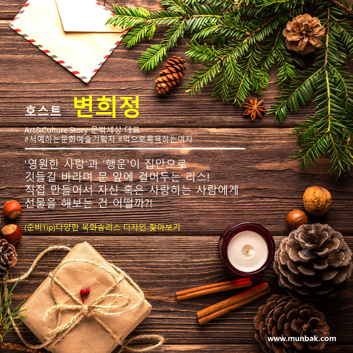 '목화꽃 필무렵'이라는 사업의 일환으로 11월 초에 목화마을활력소에서 진행했던 '목화솜리스 만들기' 프로그램의 반응이 너무 좋아서, 이번 예술상점에도 함께 하게 됐답니다. '영원한 사랑'과 '행운'이 집안으로 깃들길 바라며 문 앞에 걸어두는 리스! 직접 만들어서 자신 혹은 사랑하는 사람에게 선물을 해보는 건 어떨까요? 분명 연말이 좀 더 따뜻해질 거라 확신합니다. 또한, 2019년엔 사랑과 행운이 늘 그대의 곁에 머물 겁니다.